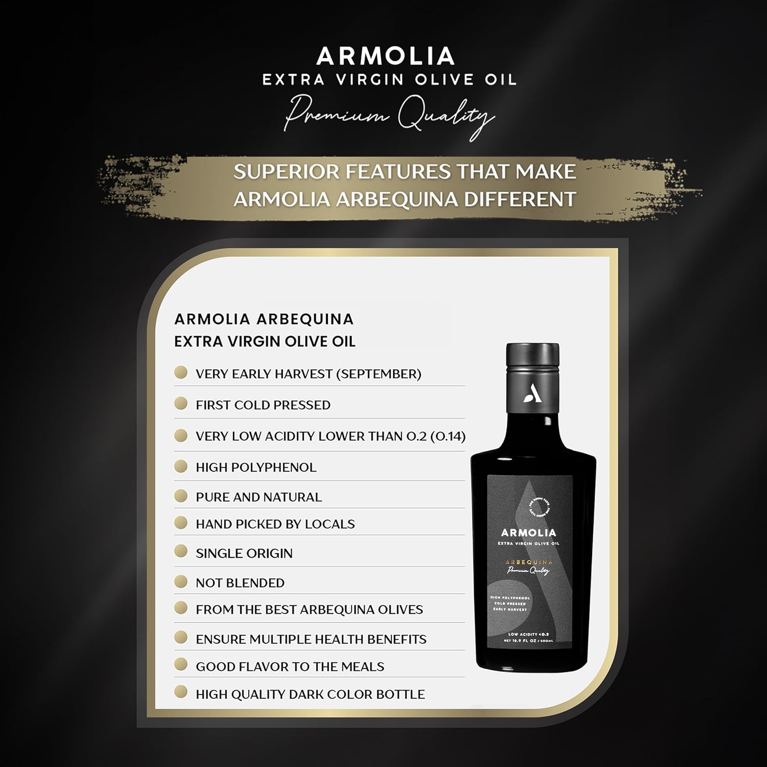 ARMOLIA Pure Olive Oil Extra Virgin Cold Pressed Glass Bottle, EVOO 2025 Gold Award Winner Drinking Polyphenol Rich Olive Oil Early Harvest, High Polyphenol (<400 mg/kg) Low-Acidity (0.14%), Hand Picked (500ml)