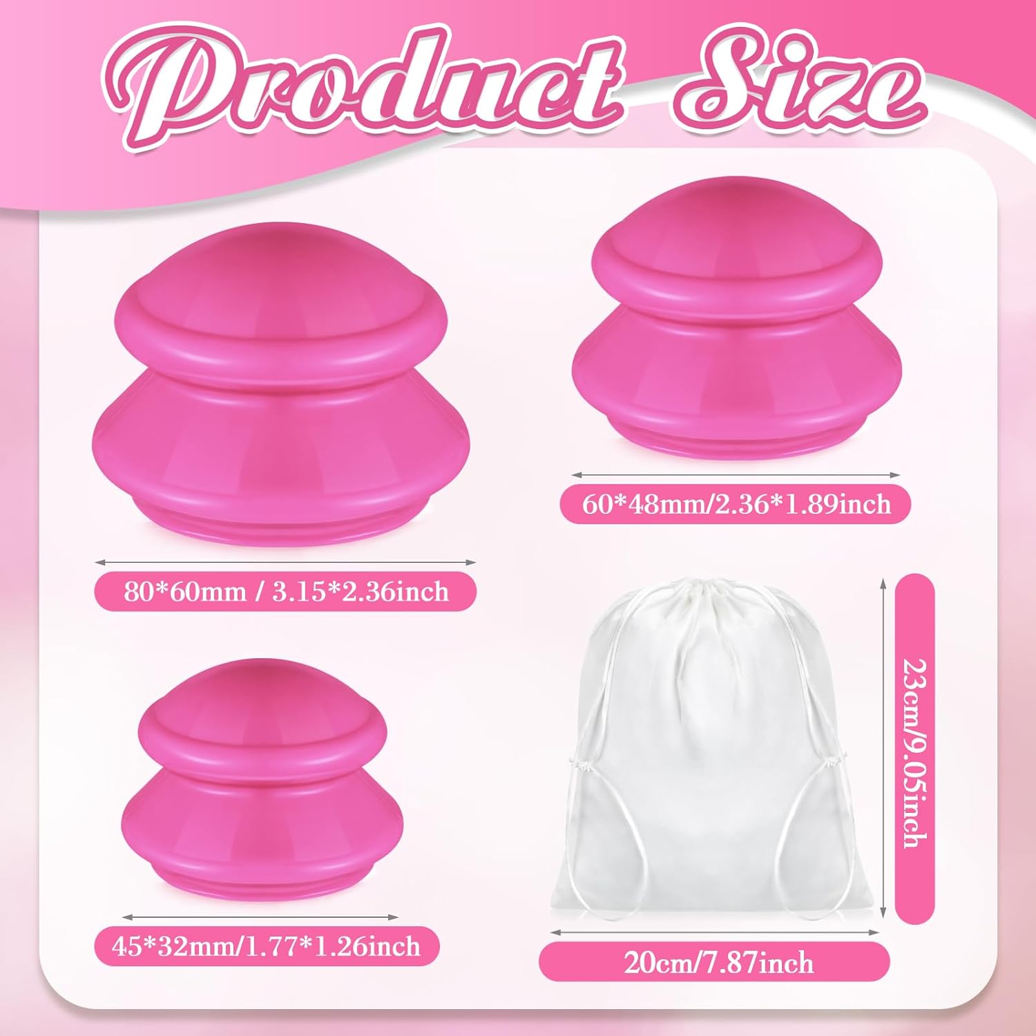 - Varied Sizes and Multipurpose Use: this silicone cups come in a variety of sizes to suitably match your needs; Large cups measure 3.15 x 2.36 inches, medium 2.36 x 1.89 inches, and small 1.77 x 1.26 inches; Whether your aching body needs to relieve pain on your shoulders, back, waist, arms, or legs, this massage cupping set has got you covered; Made of durable material and featuring a rose red color, our products are designed for a wide range of applications