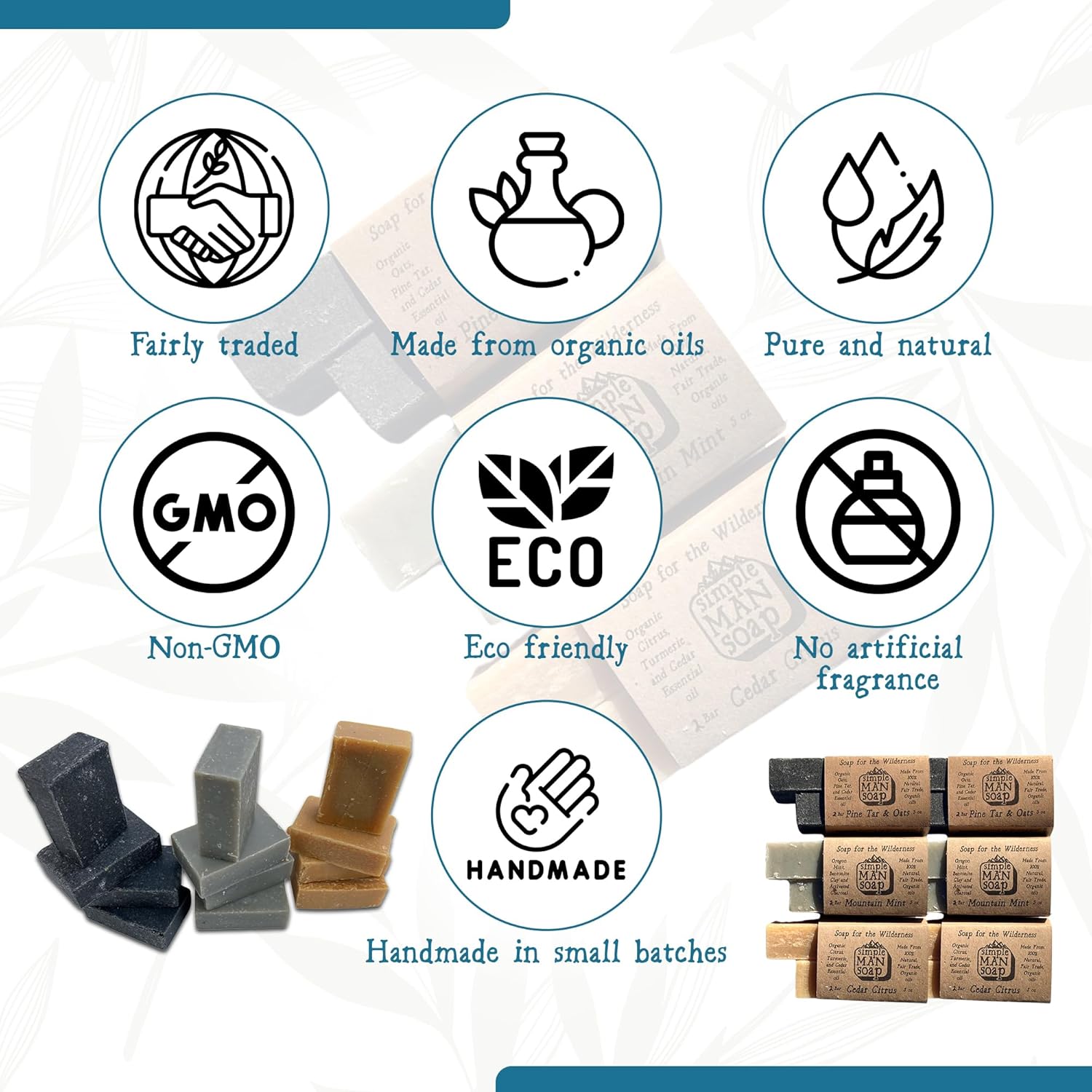 - Skin-loving organic ingredients: Our cold process artisan men's soaps are made in small batches by using organic, fair trade ingredients and pure essential oils. We craft our soap bars by hand using healing and nourishing ingredients like Bentonite Clay, Activated Charcoal, Organic Coconut oil and Turmeric root.