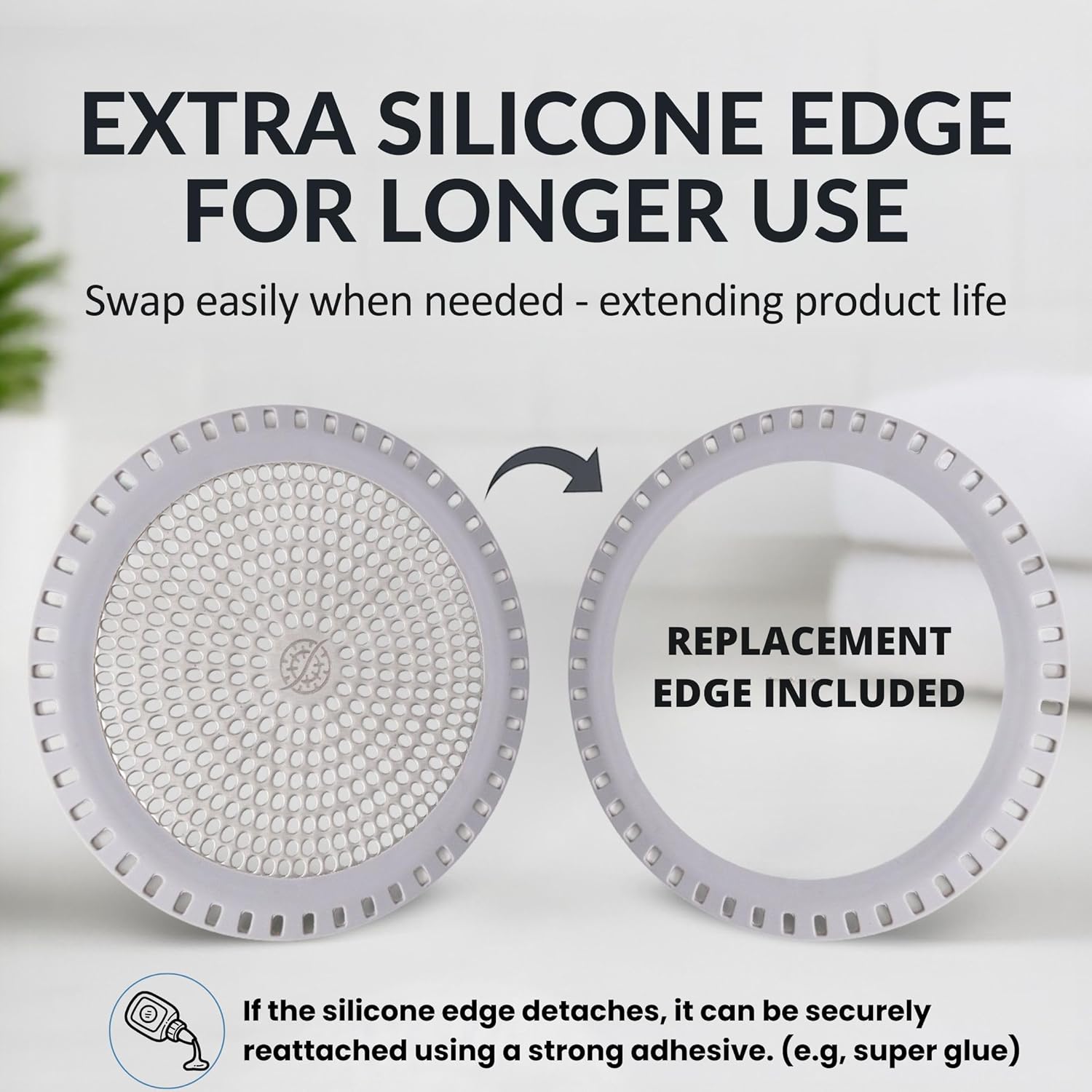 - Stainless Steel + Non-Slip Silicone Edge: Premium stainless steel hair catcher shower drain with a soft silicone rim that grips tile securely. Won’t slip, slide, or lift on wet, soapy surfaces—unlike cheap plastic strainers. This durable shower drain protector is built for daily use and designed to last, keeping your shower hygienic, clog-free, and easier to maintain.