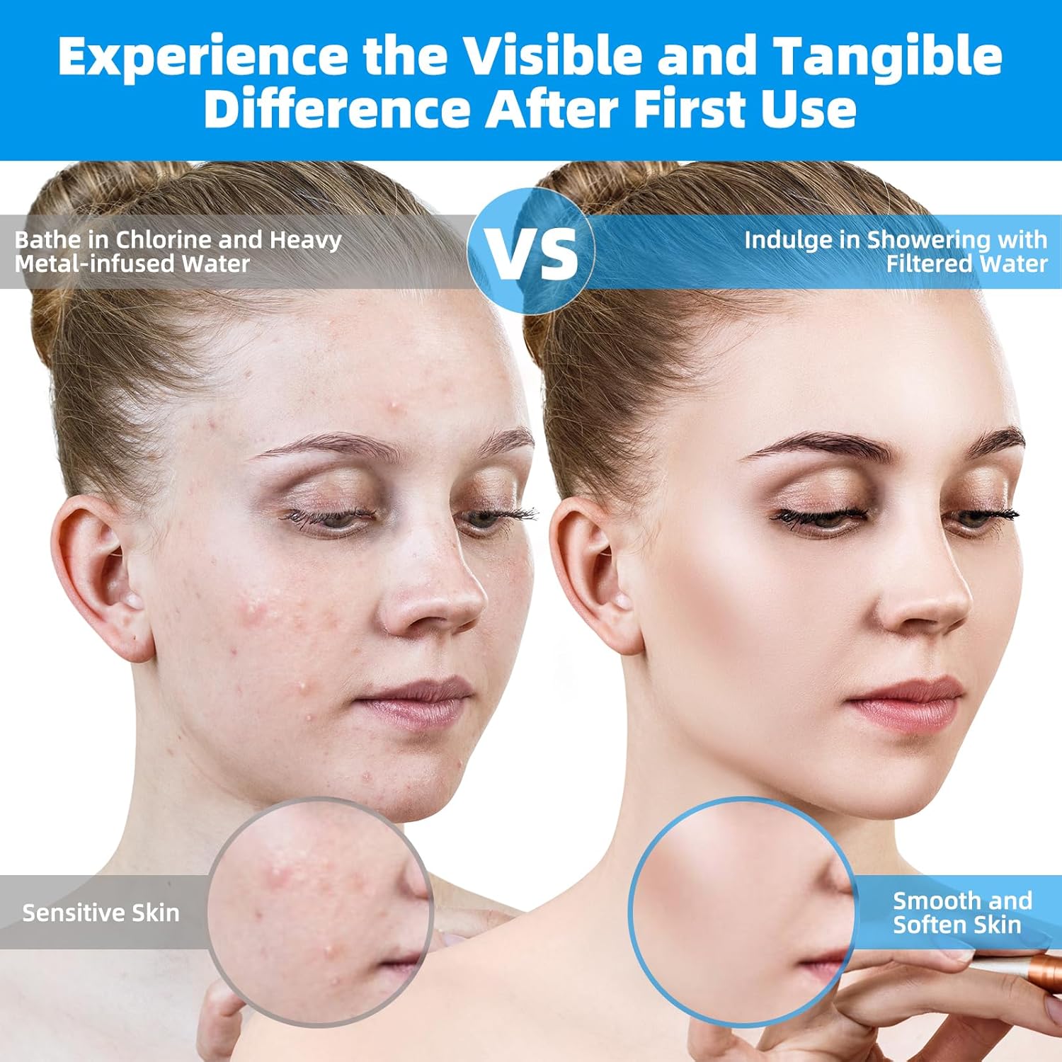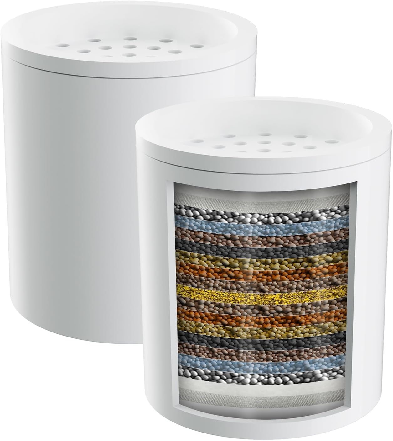 - [20-Stage Shower Filter] Our innovative and high-output 2 pack shower filter cartridge replacement effectively reduces chlorine, dirt, and smells, quickly relieving fatigue while also preventing scale buildup. It restores damage caused by hard water to your hair, skin, and nails. Enriched with Vitamin C, our shower filter also prevents eczema, dry skin, and dandruff.