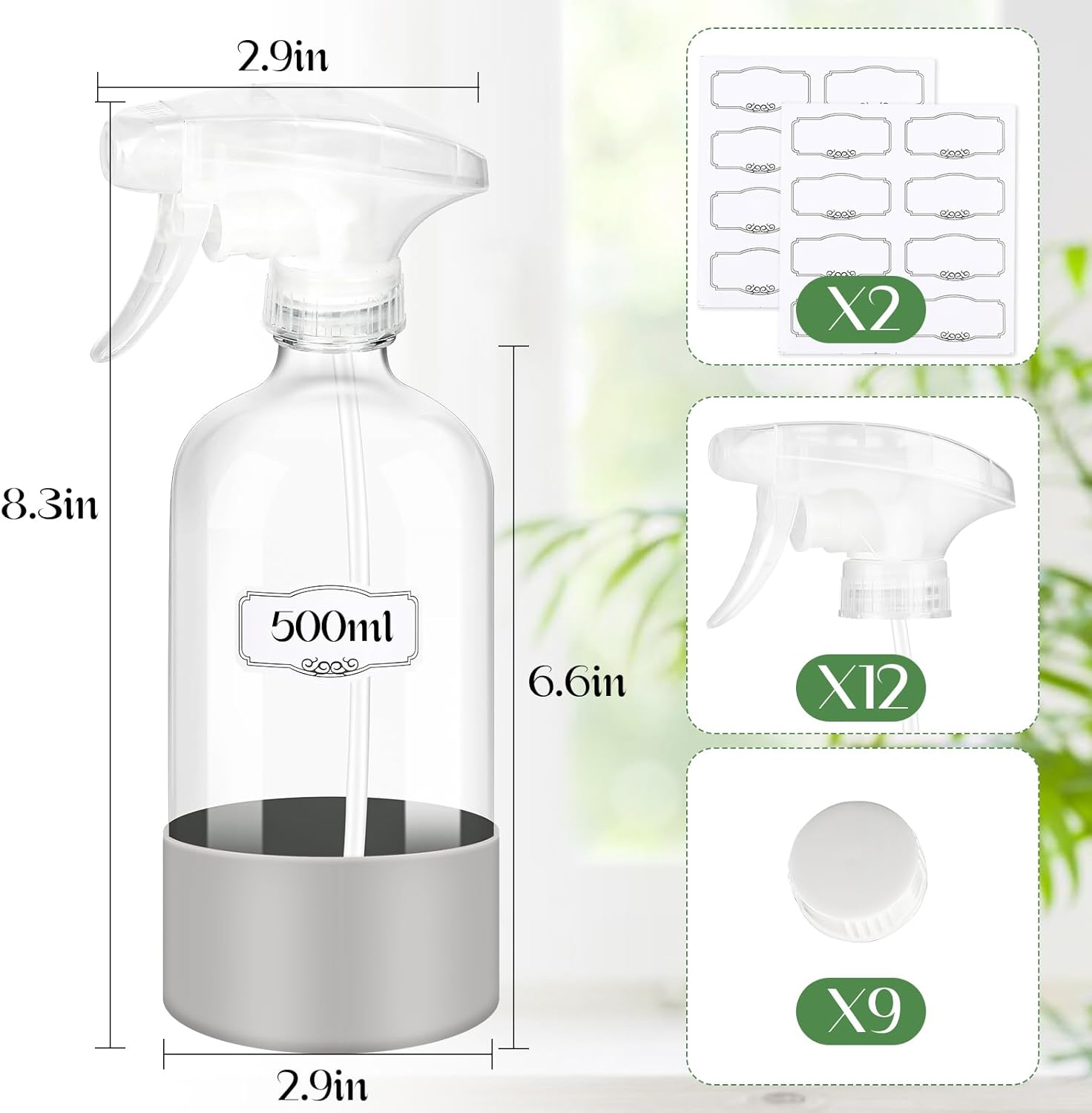9 PACK/16 OZ Glass Spray Bottles with Upgraded Adjustable Spray Nozzle, Refillable Containers with Silicone Sleeve, Spray Bottle for Hair&Cleaning Solutions&Essential Oils-Pink Blue Gray