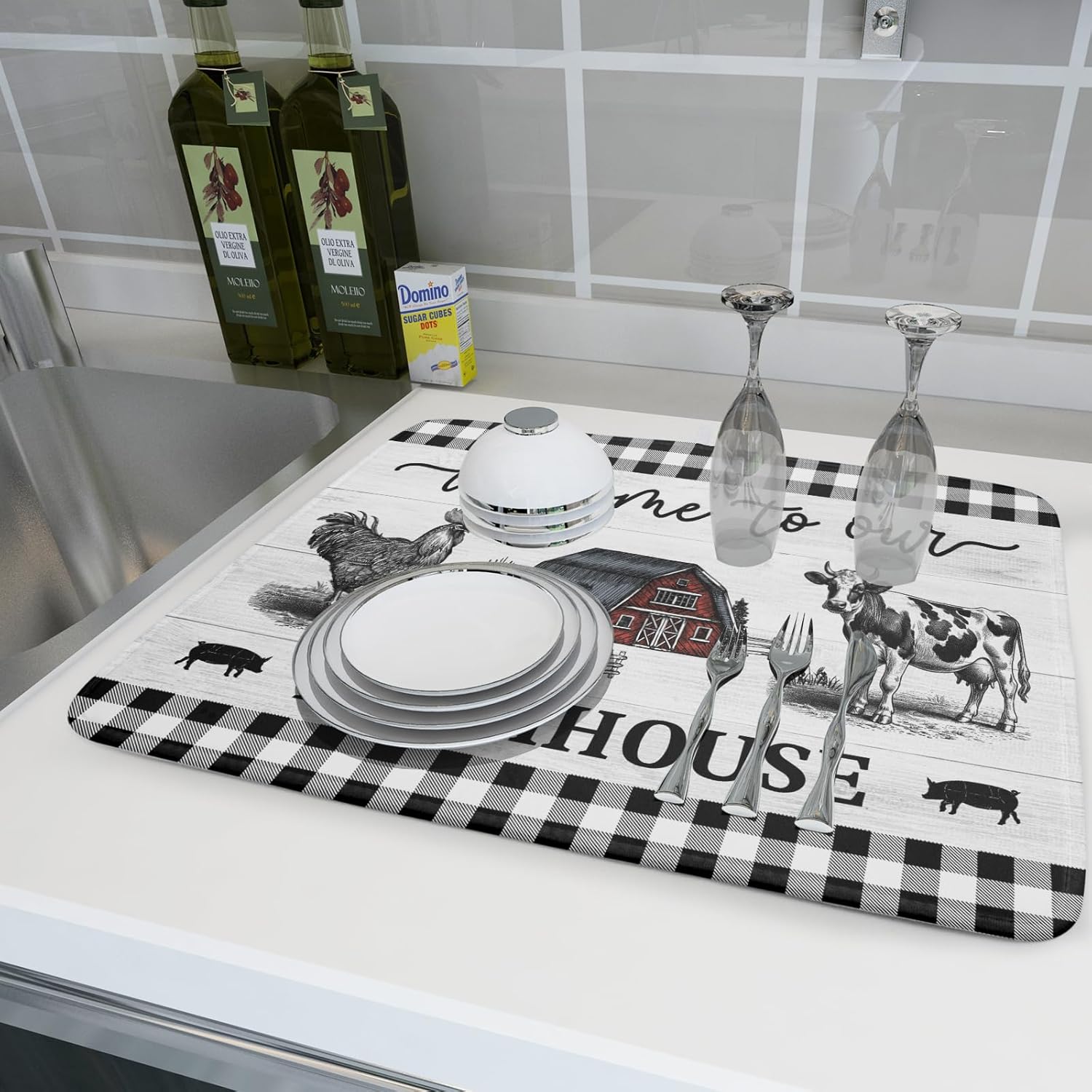 Farmhouse Barn Dish Drying Mat 18x24 Inch Cow Rooster Absorbent Microfiber Dish Drainer Rack Pad Bottles Protector for Kitchen Counter