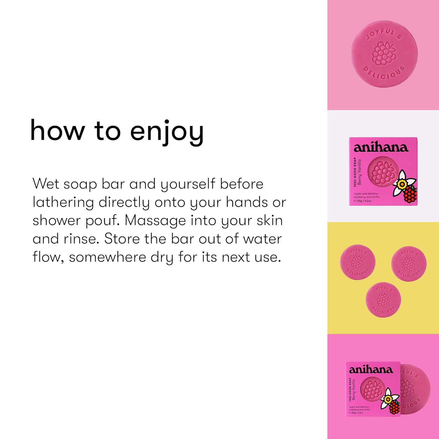 - VIBRANT SCENT: Anihana Berry Vanilla Feel-Good Soap delivers deliciously sweet, candy-like scents of fresh raspberries and rich vanilla to bring a smile to every wash