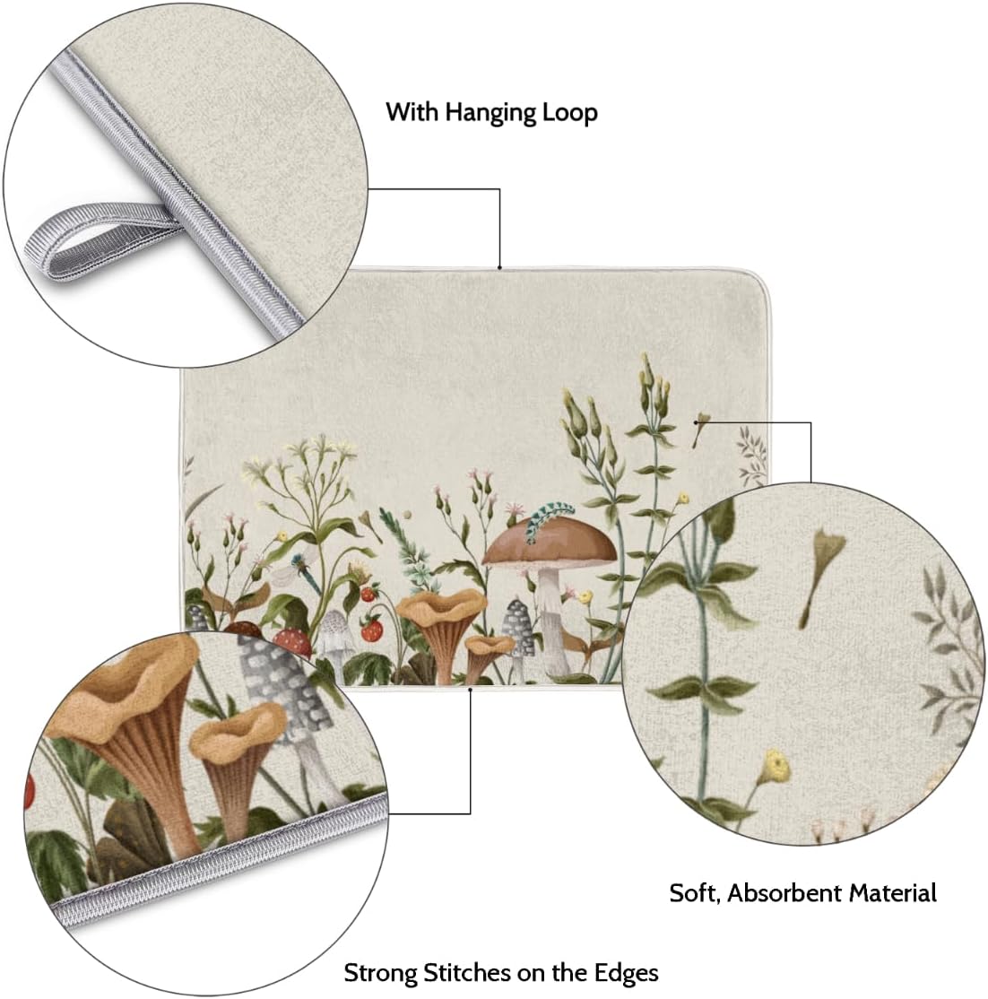 Hexteria Dish Drying Mat for Kitchen Counter Kitchen Drying Mat Dish Rack Mat Dish Drainer Pad Microfiber Absorbent Washable Drying Pad for Countertop, Mushroom
