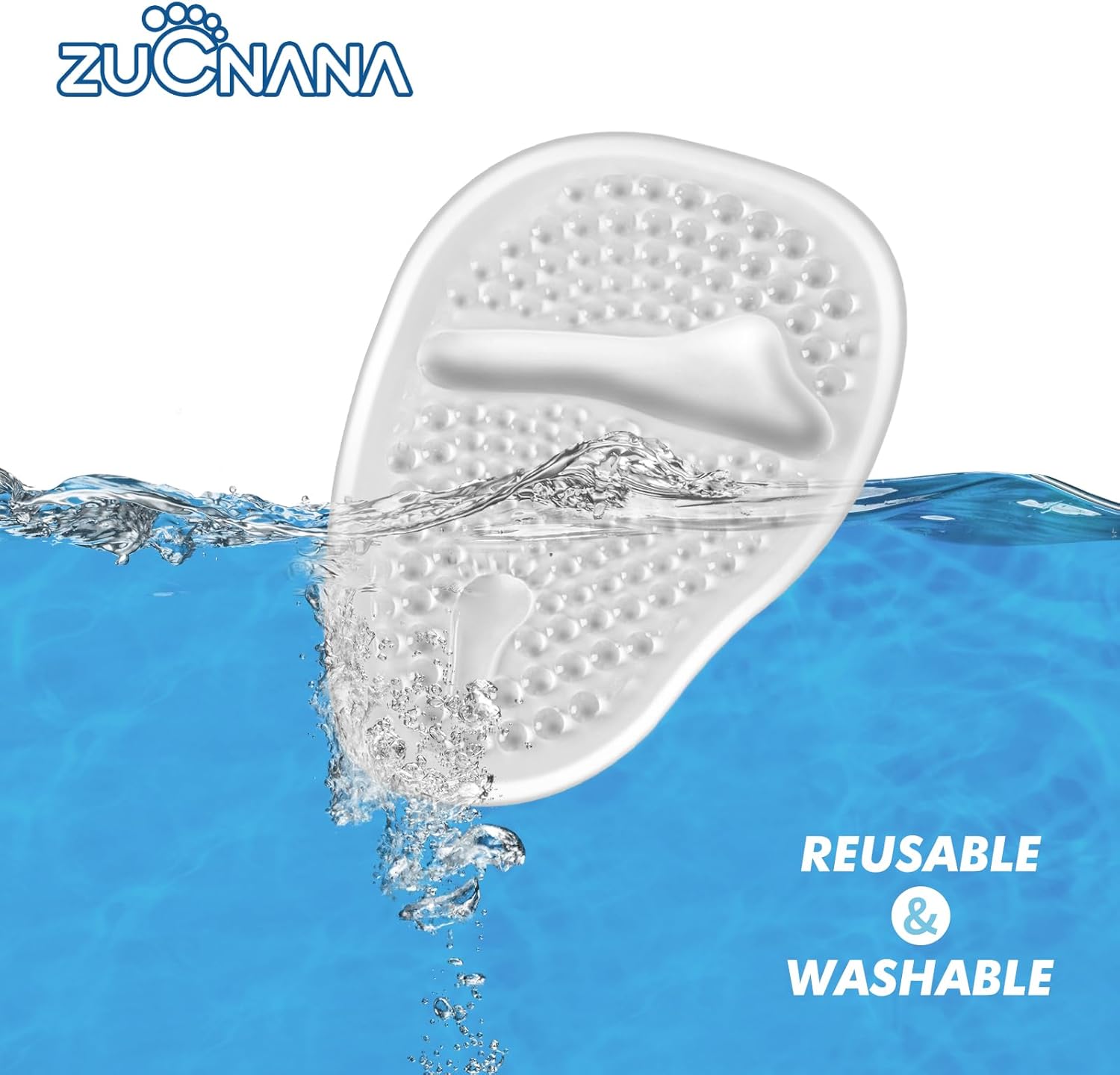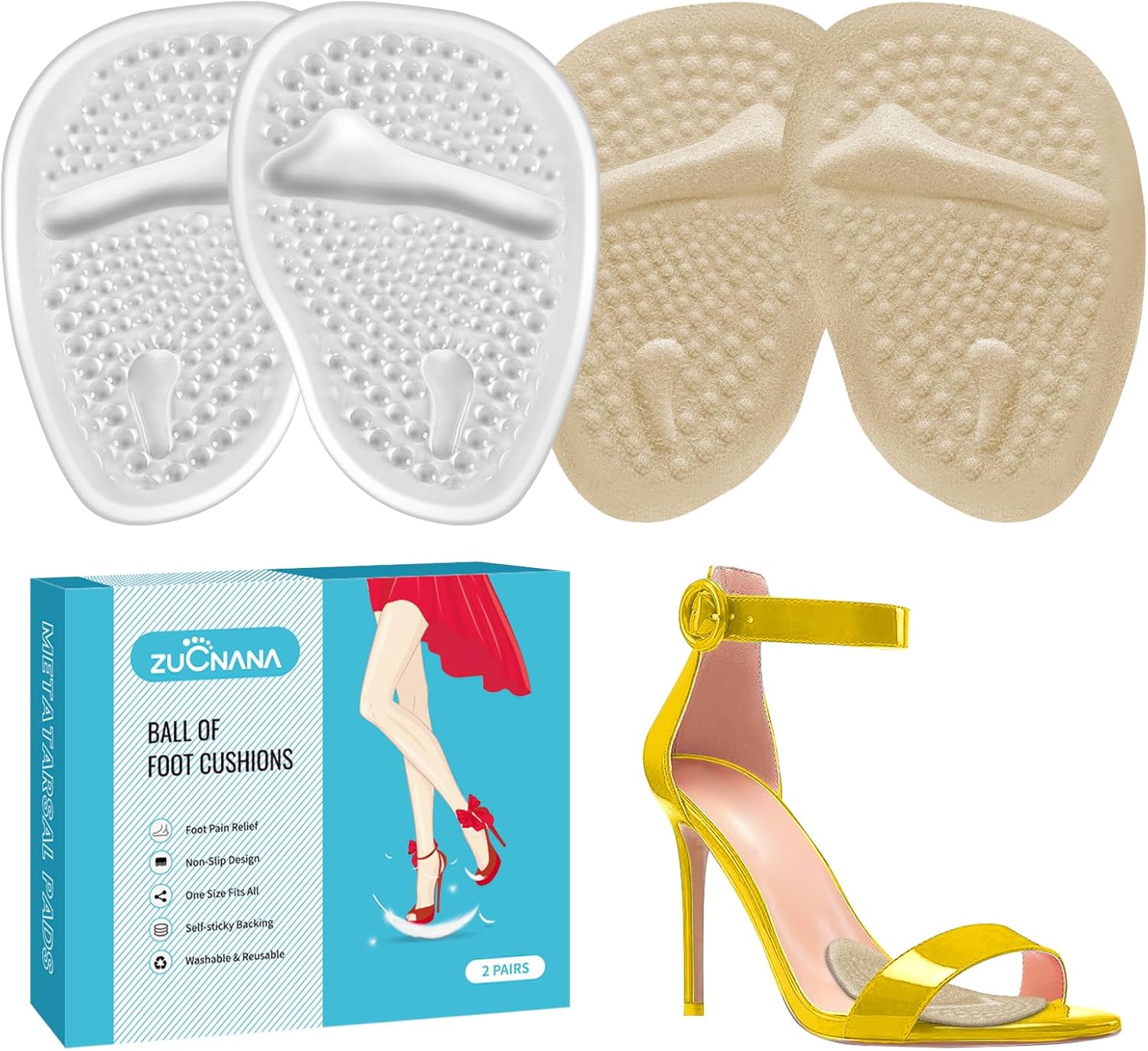- WEARING SHOES WITHOUT PAIN: ZUCNANA ball-of-foot cushions are made by premium and soft gel. No matter you work, dance, or go shopping in heels, these metatarsal pads provide great cushioning and shock absorption, and help relieve foot pain