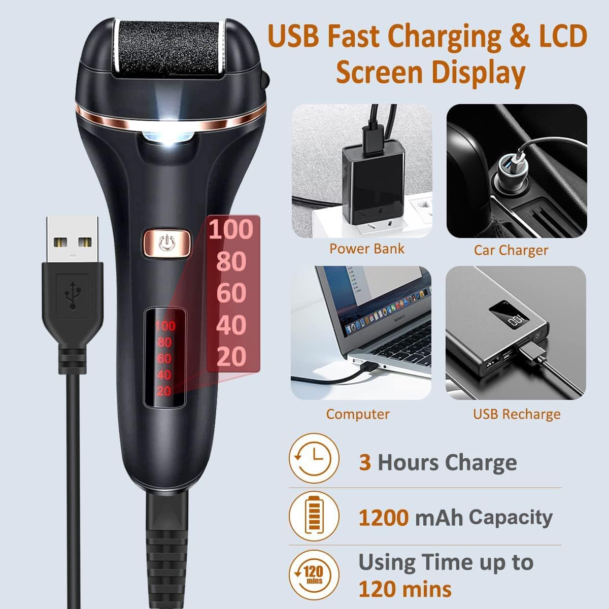 - 【 Power Level Indicator】 Rechargeable foot callus removers charging time for 2-3 hours, it can powerfully run continuously for about 120 Minutes. USB Charging Cable can be charged easily with power bank, car charger, computer, etc. You can easily see how much power left and when to charge.