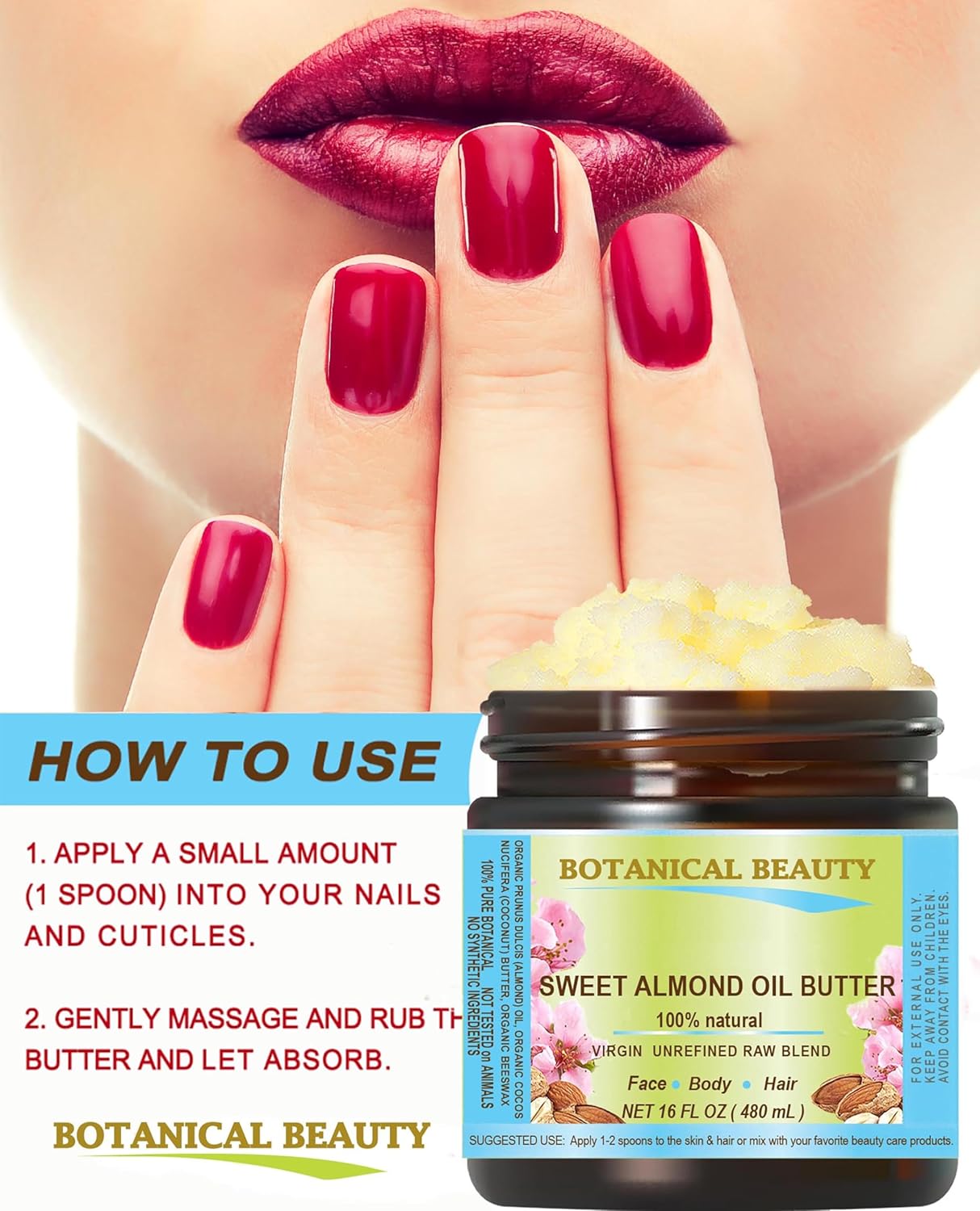 - Use Topically for DAMAGED HAIR, DRY SCALP AND BRITTLE NAILS. SWEET ALMOND OIL BUTTER promotes silky soft hair, prevents moisture loss and adds elasticity and suppleness, and also provides an immediate sparkle and shine, and helps to mend split ends. It is a powerful moisturizer, perfect Natural Skin Moisturizer, Skin Facial Oil Butter, Face moisturizer, Face Butter, Hair Butter.