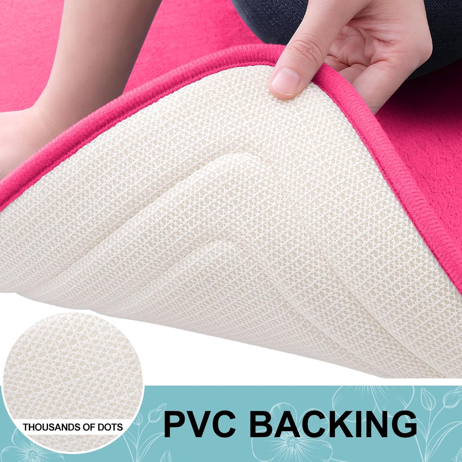 - [STABLE FOOTING] Our bathroom mat is equipped with a robust and enduring PVC backing, preventing shifting and skidding. Unlike mats with rubber backing that may wear off after washing, our bath mat ensures lasting durability. For a secure footing, keep the floor beneath the rug dry and avoid placing it on wet surfaces.