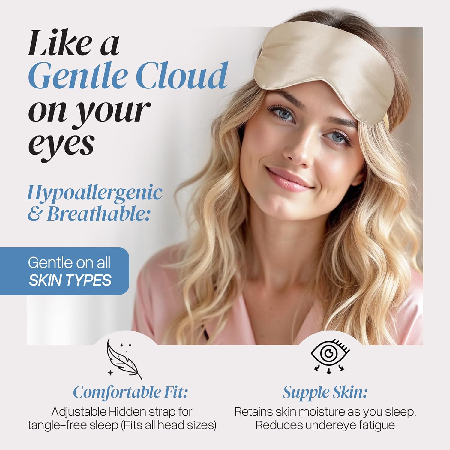 Silk Sleep Mask - Luxurious 100% Pure Mulberry Silk Eye Mask for Restful Sleep and Travel, Hypoallergenic, Cooling, Total Blackout, Adjustable for Women & Men (Champagne Gold)