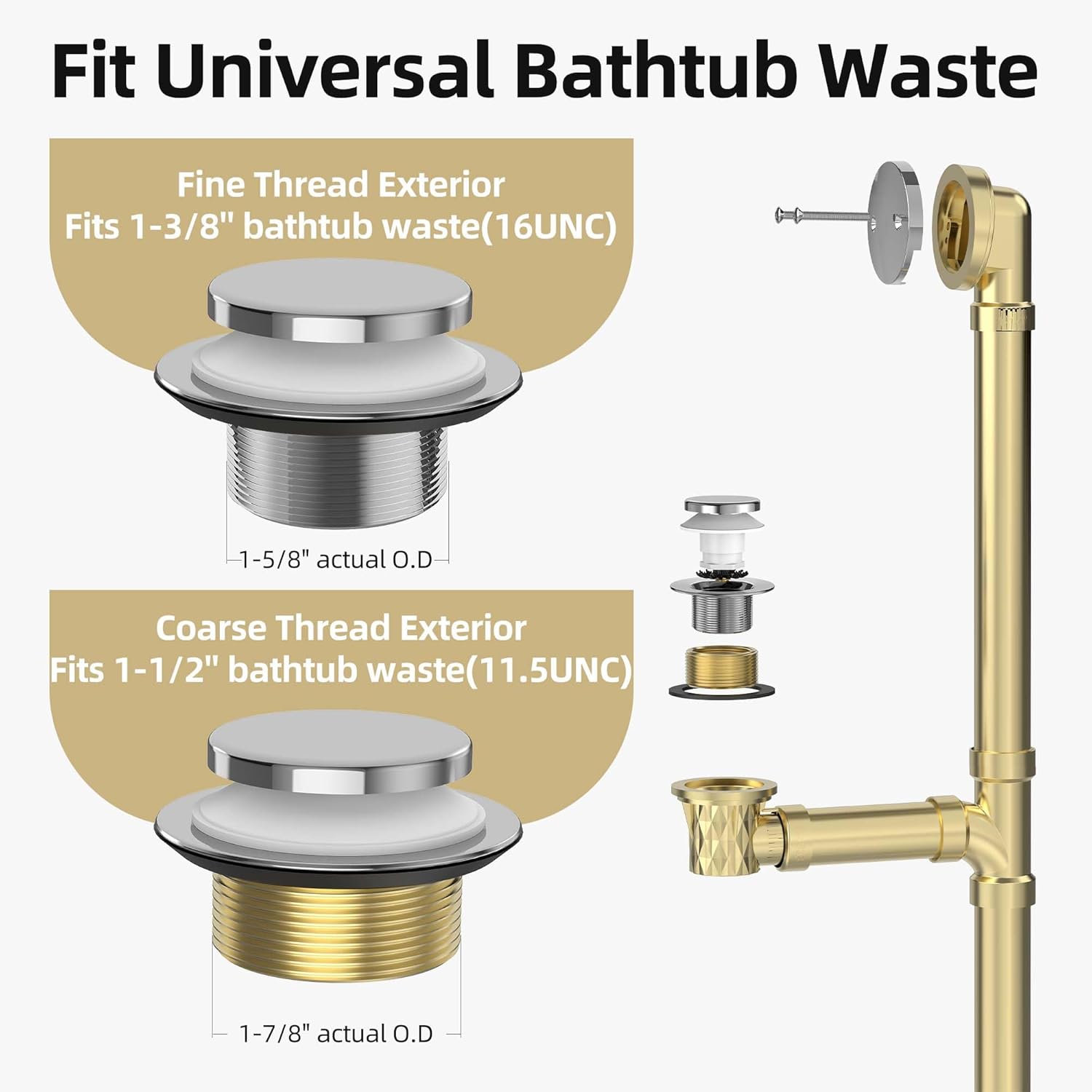 - Universal Fit: Chrome plated bathtub drain is cUPC approved; fits 1 3/8 in. NPSM and 1-1/2 in. NPSM bathtub waste elbows; designed to work with US/CA standard bathtubs