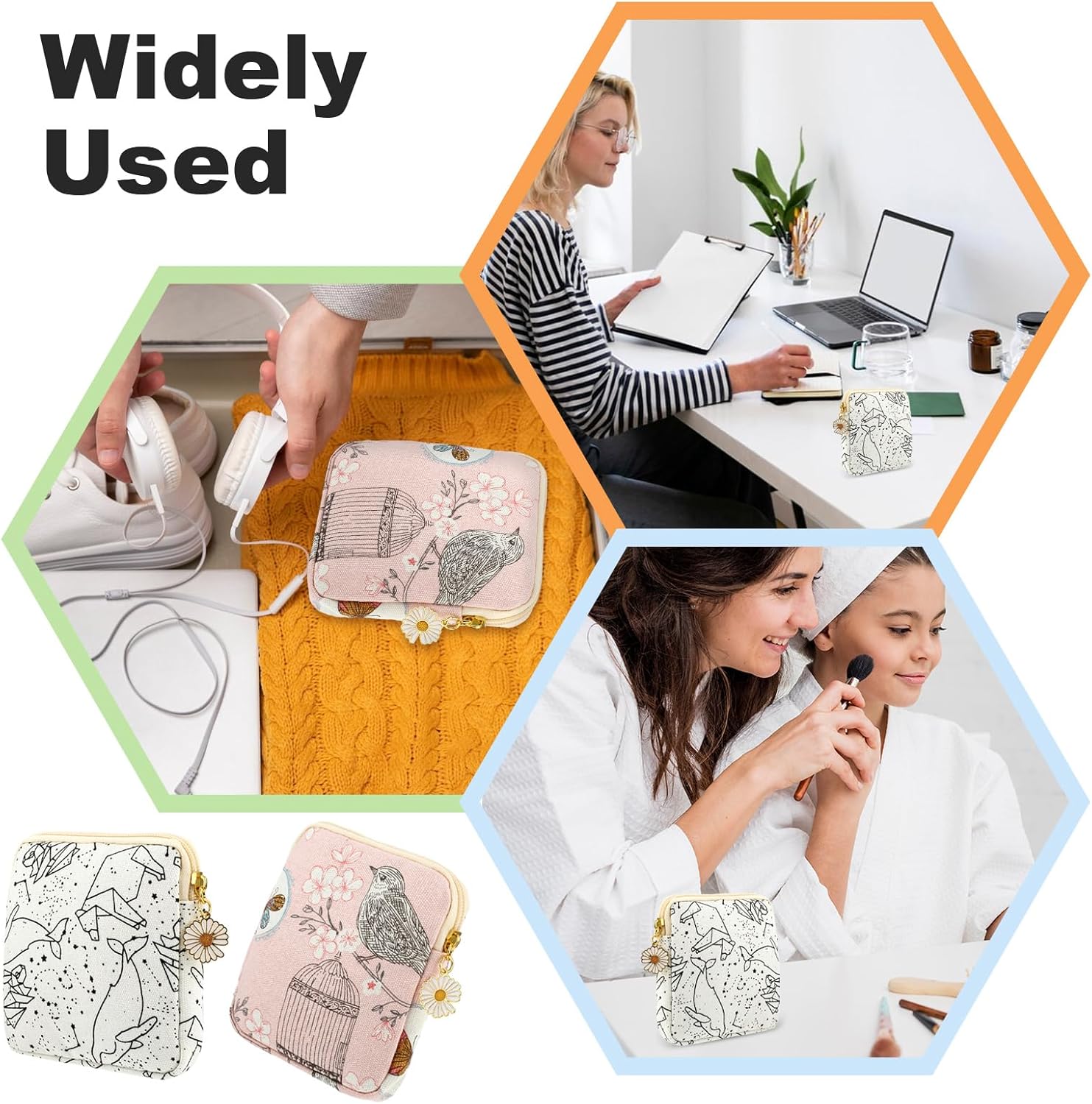 cobee 2PCS Sanitary Pad Storage Bag, Cute Sanitary Napkin Storage Purses Portable Period Bag with Daisy Zipper Panty Liner Tampon Menstrual Cup Nursing Pad Holder Pouch for Girls Women Travel(Bird)
