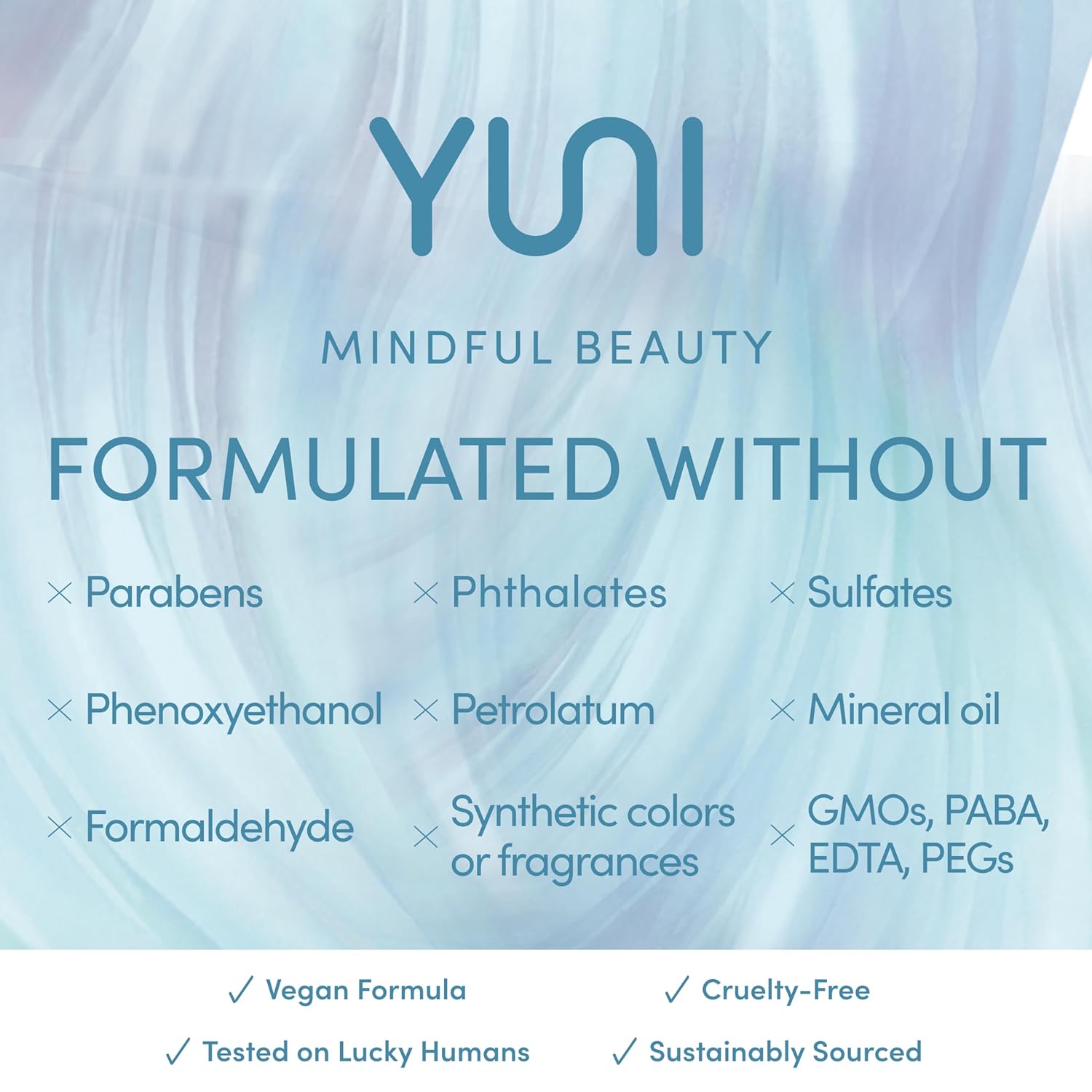 - MINDFULLY MADE: YUNI Beauty products are made with skin-loving ingredients, plant-based, vegan, cruelty-free, gluten-free with no parabens, sulfates, phthalates, sodium lauryl/laureth sulfates, mineral oil, synthetic colors or fragrances. Tested on lucky humans (never on animals), the organic, natural ingredients are consciously and sustainably sourced.