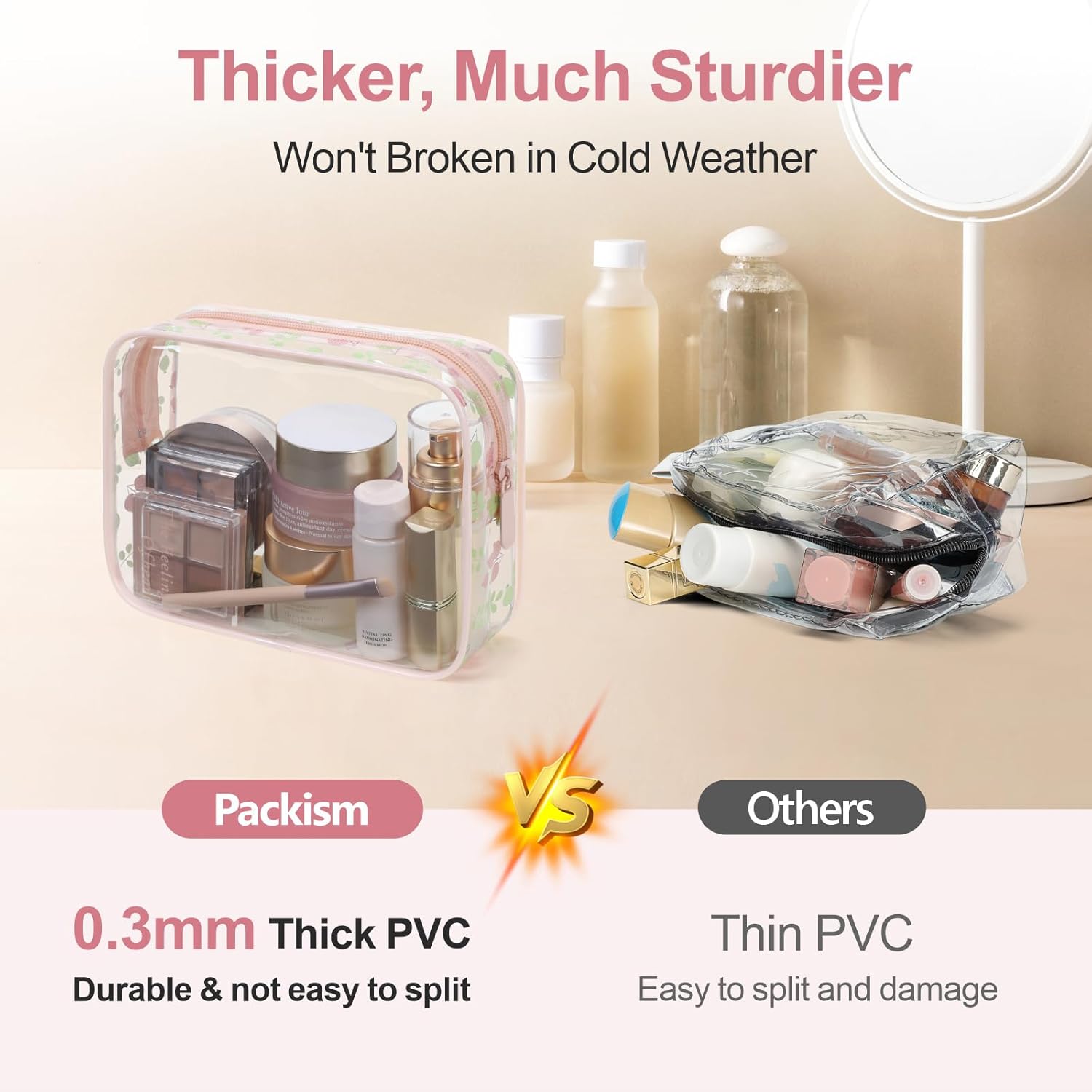 - Robust and Long-Lasting: Our clear toiletry bags outlast the average flimsy plastic bag on the market, for it is made from 0.3 mm thick PVC. Its reinforced design features heat-sealed and metal closures, ensuring it withstands even the tumultuous travel for sustainable reuse