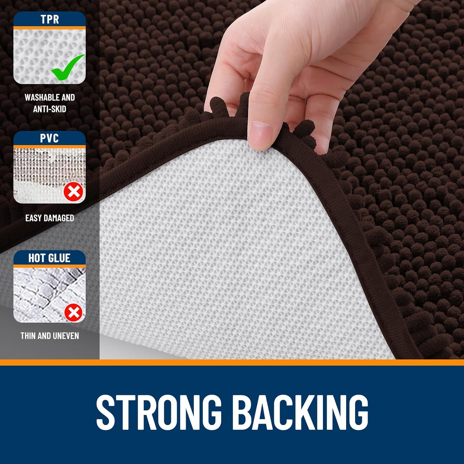 - Long-lasting and Sturdy - Our bath mat features a textured rubber backing for stability, surpassing the durability of other brands using PVC or hot glue. Unlike traditional materials, our TP Rubber Backing is engineered to withstand repeated washes without compromising its integrity. WARNING: Water under the bathroom rug can cause it to slip. Keep bottom of the bath rug dry!