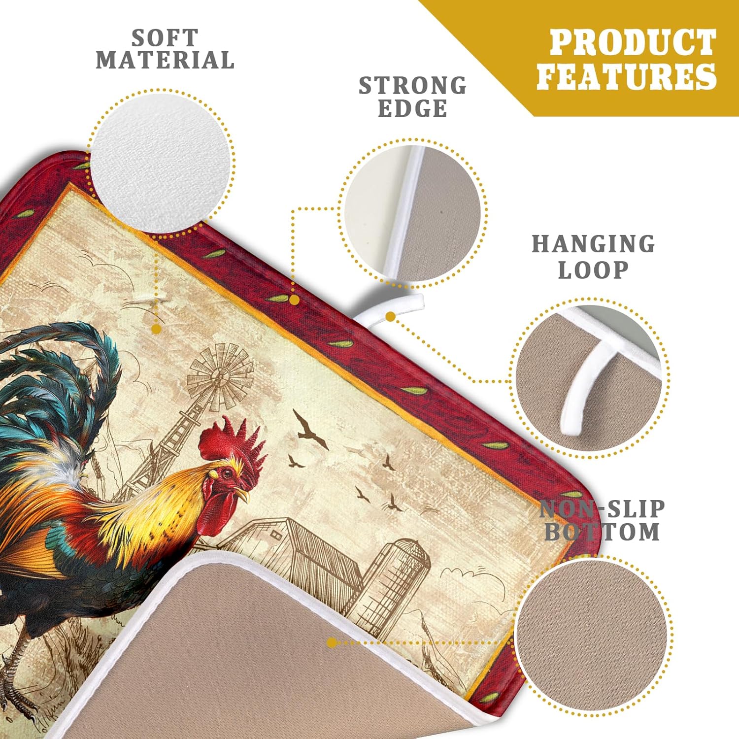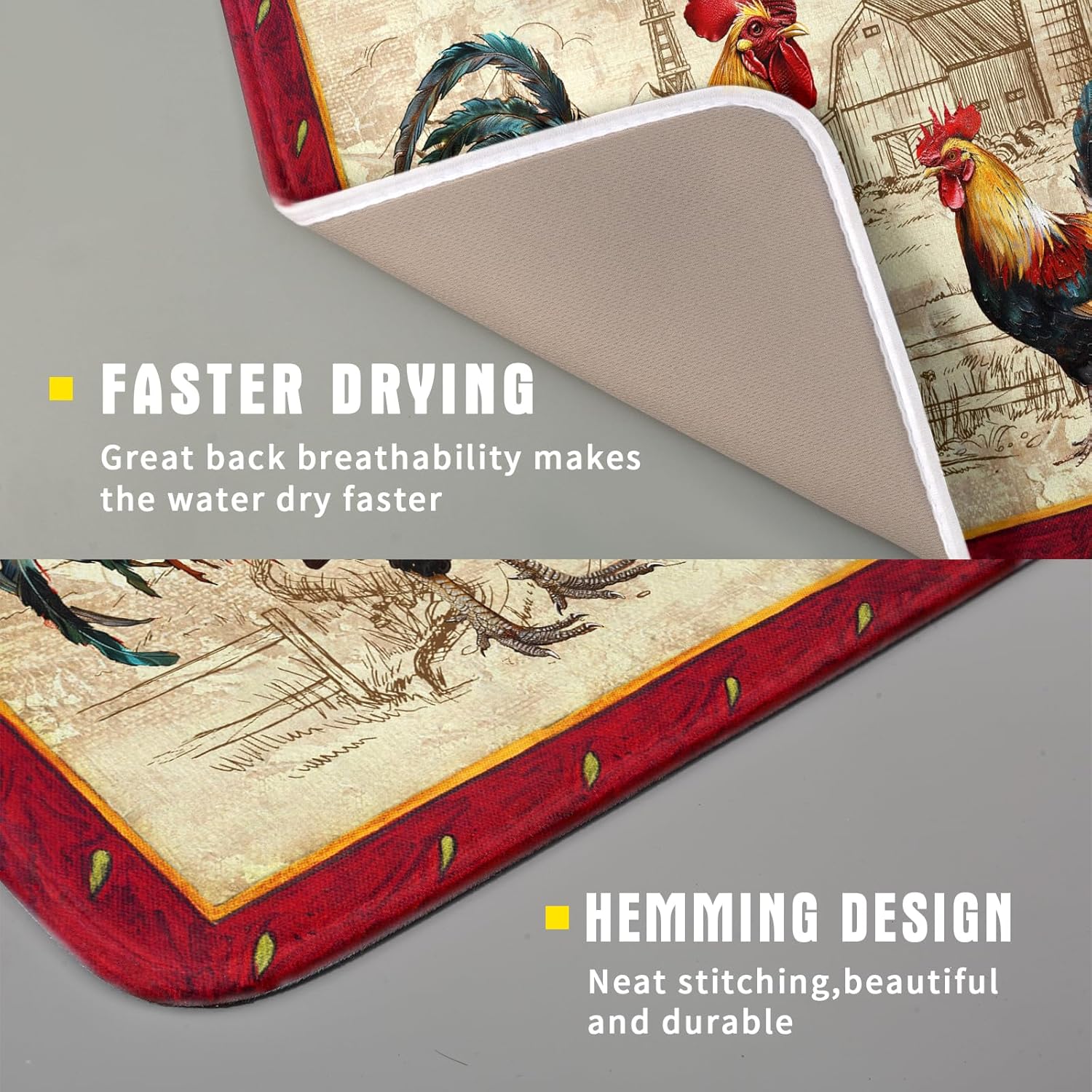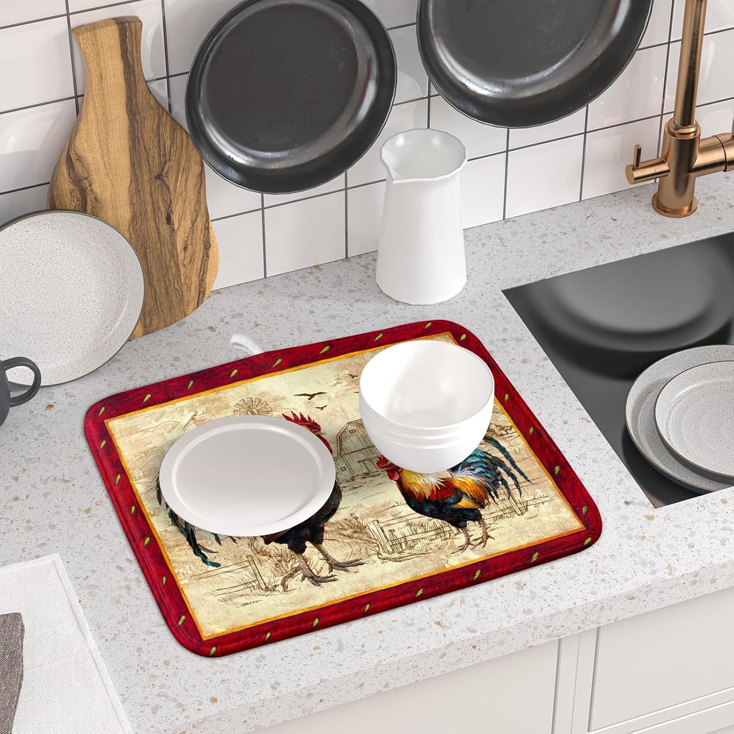 Farm Rooster Dish Drying Mat for Countertop 16x18 Inches Red Rustic Chicken Absorbent Microfiber Dry Dishes Pads Kitchen Counter Accessories