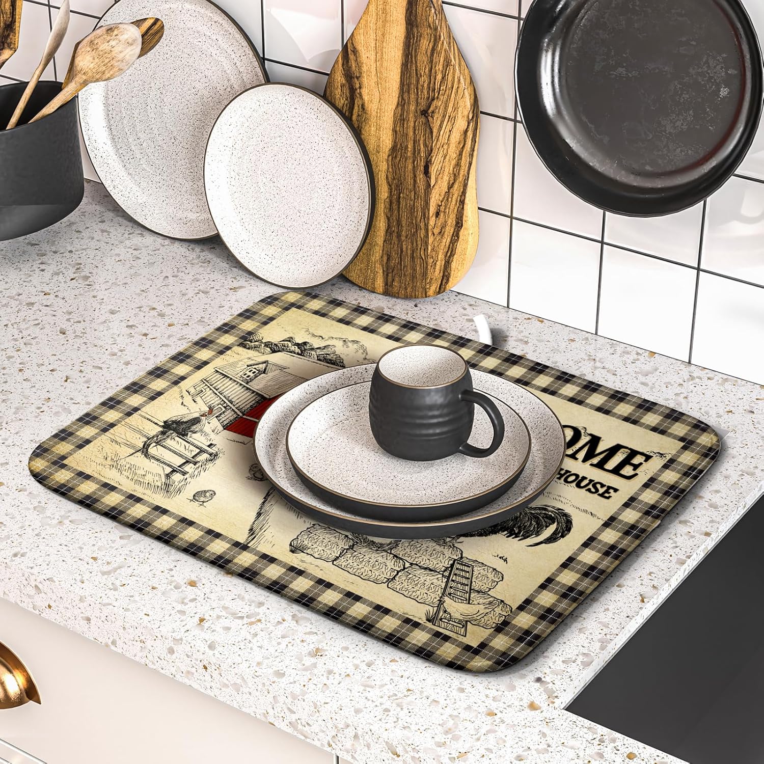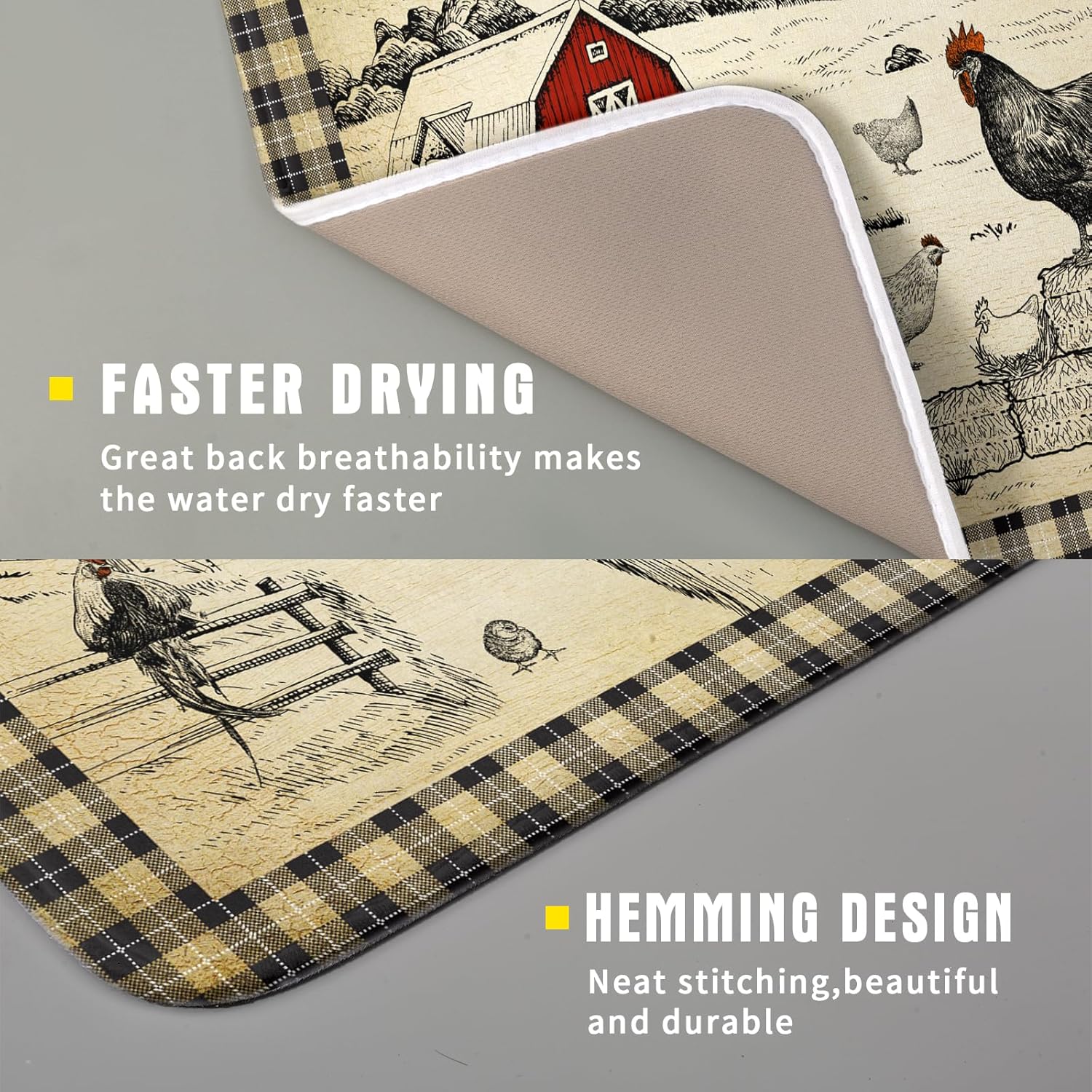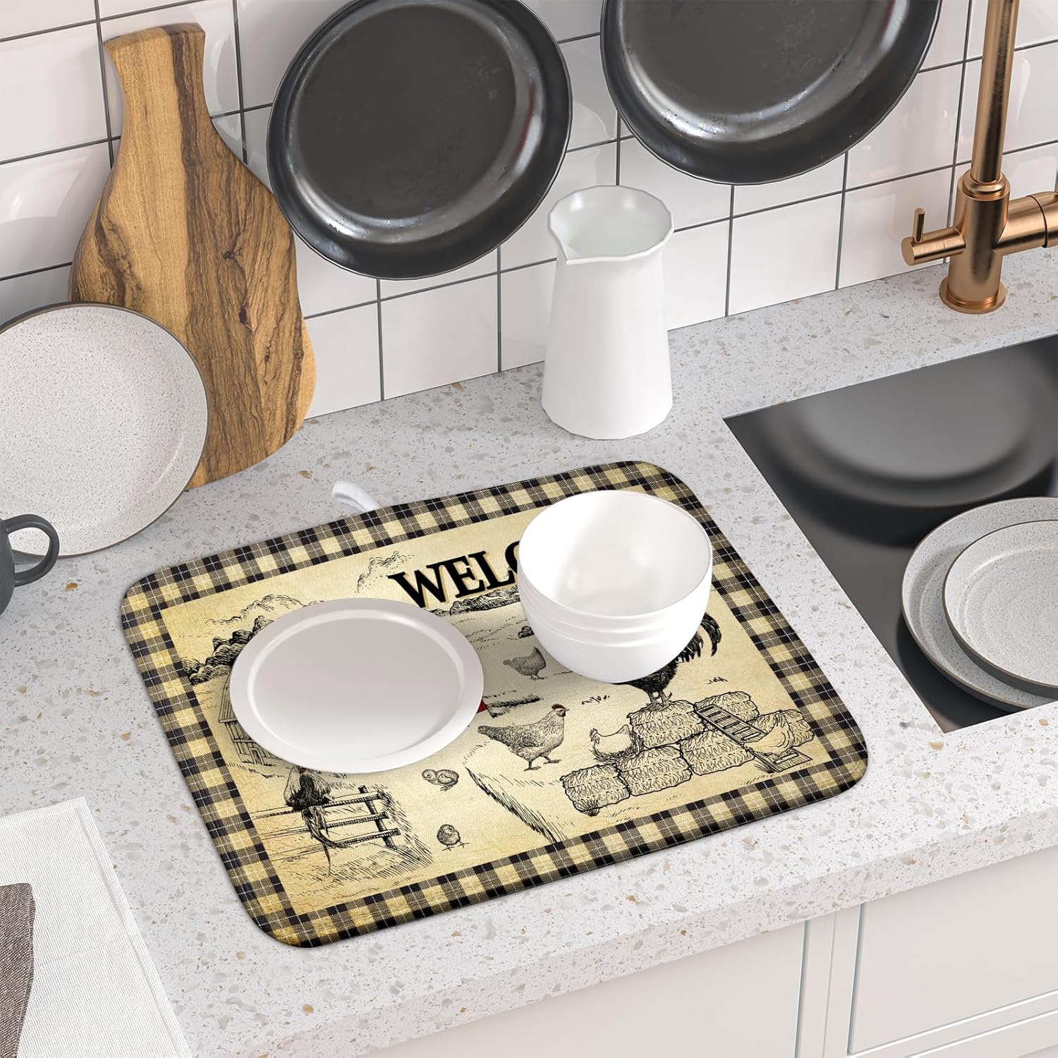 Farmhouse Rooster Dish Drying Mat 16x18 Inch Country Chicken Absorbent Dish Drainer Mat Reversible Countertops Protector Pad Kitchen Accessories