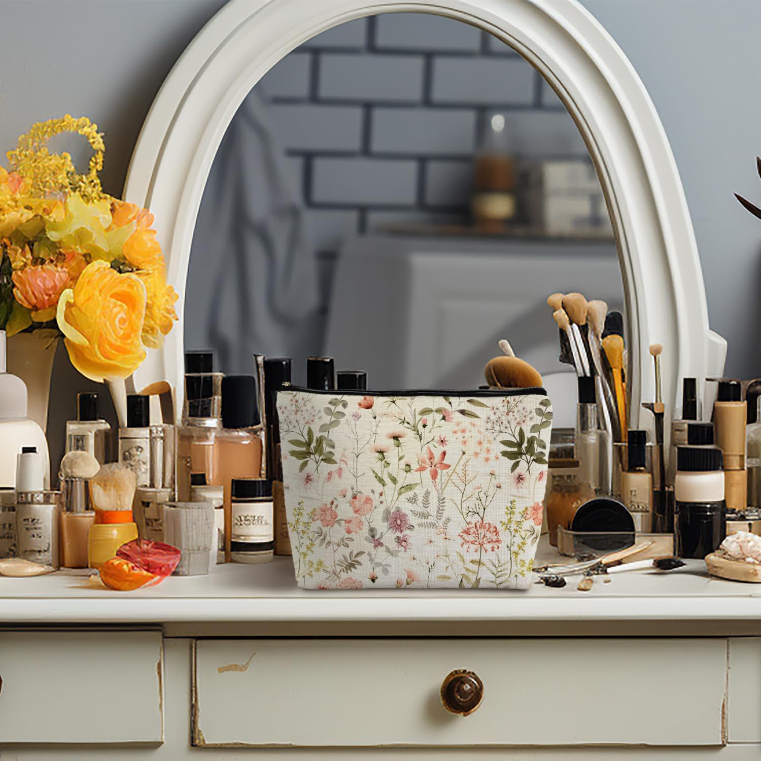 Floral Flower Makeup Bag, Cosmetic Bag for Women, Small Makeup Bag for Purse, White