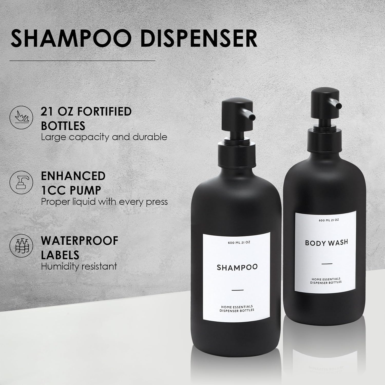 - BATHROOM SHOWER DISPENSER SET OF 3 - The Bathroom dispenser set contains 3-Pack 21oz(600ml) black bottles, 3 black pumps, 5 waterproof white labels(âSHAMPOOâ, âCONDITIONERâ, "BODY WASH", "HAND SOAP", "DISH SOAP"), the pump bottles for shampoo and conditioner are instantly help to organize your bathroom, Perfect Bathroom Essentials for home or hospitality.