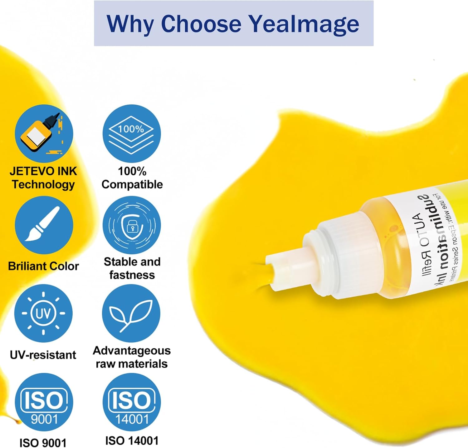 - 【Easy to Use and Wide Applications】: YeaImage sublimation ink refill bottles operate in the same way as the epson sublimation ink refill bottles, which can replacement for epson sublimation ink kit very easy. The sublimation ink is ideal for mugs, T-shirts, cloth, pillowcases, shoes, caps, ceramics, boxes, bags, quilts, cross-stitched items, decorative clothes, flags, banners, etc. Bring your creations to life printing for every occasion, especially great as gifts for friends family, and more.