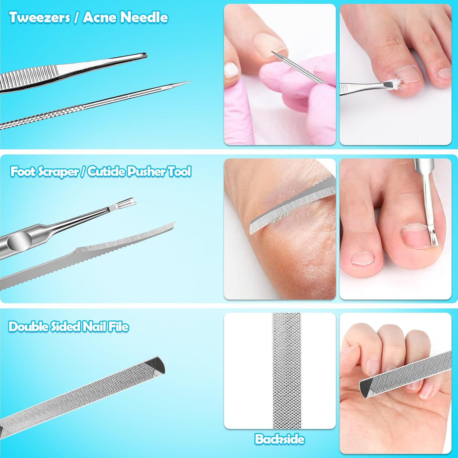 - 【Professional Toenail Clipper &Pedicure Tools】 After you trim, you can use our nail file to smooth out some sharp parts. The double-sided design provides you with more convenient use. We've added a dead skin fork and a peeling knife uniquely, easy to remove or push up the dead skin on your nails.