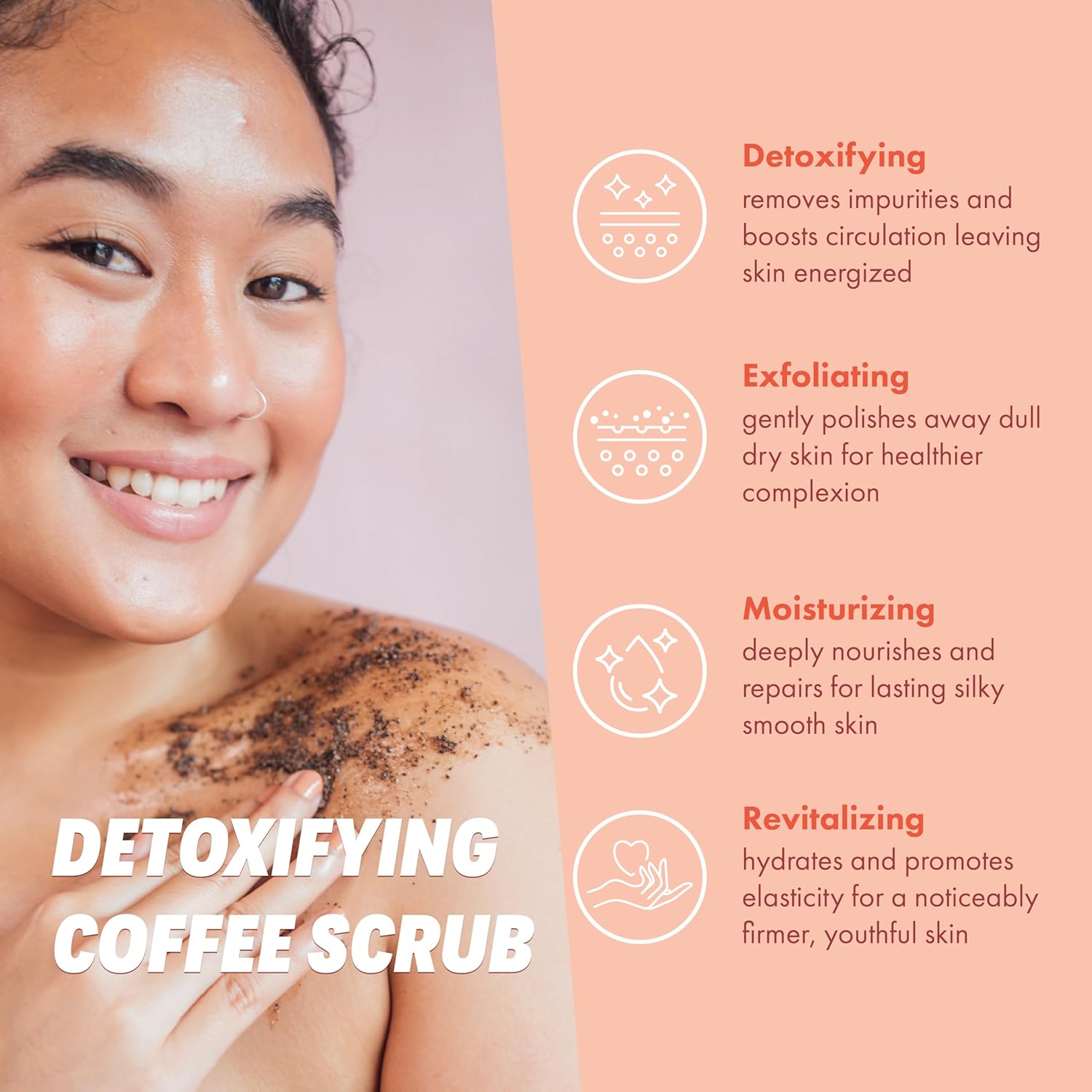 - Detoxing with coffee extract and orange peel to stimulate blood circulation and promote skin renewal. Reduce the appearance of body acne, cellulite, blackheads, wrinkles, fine lines, shaving bumps, spider veins, blemishes and more