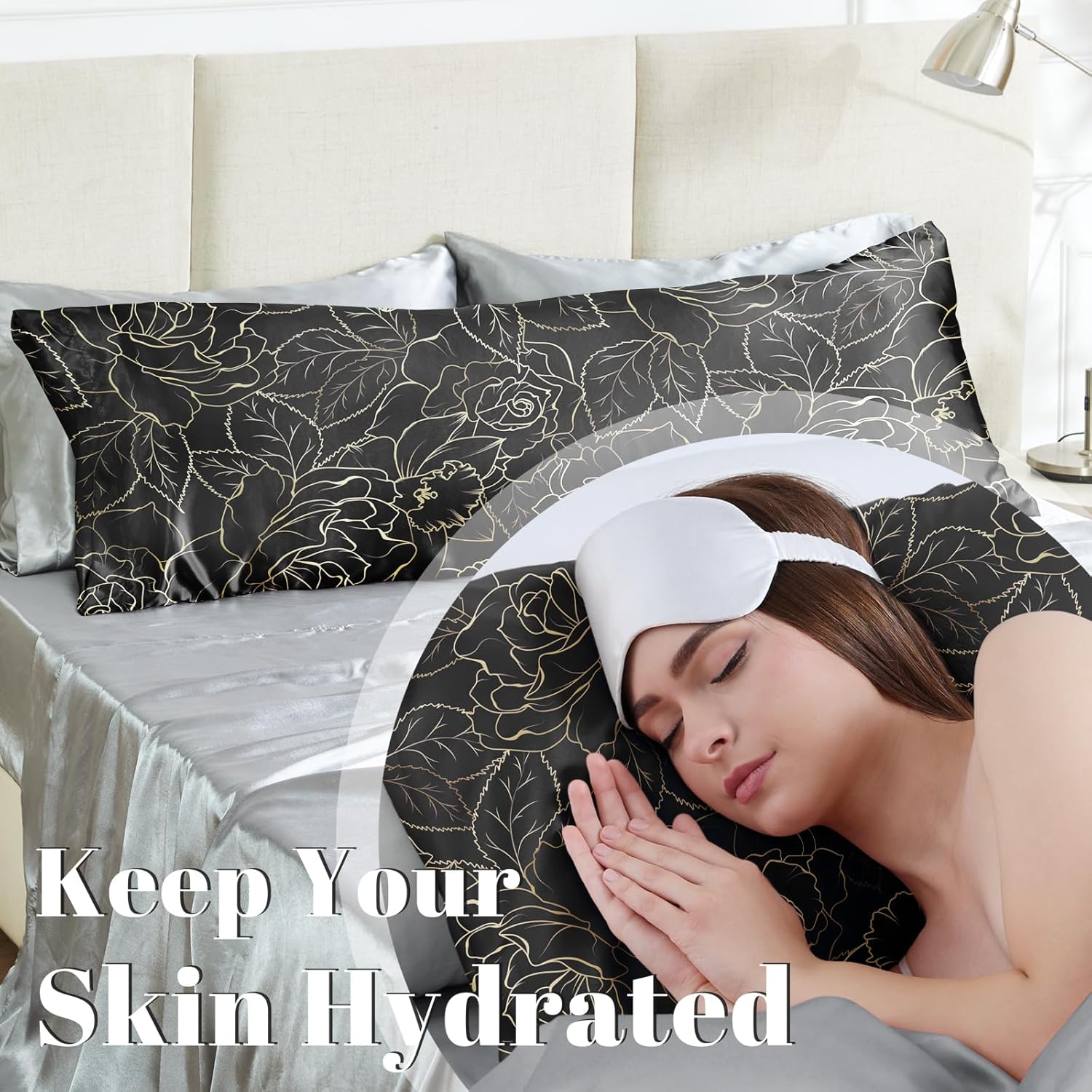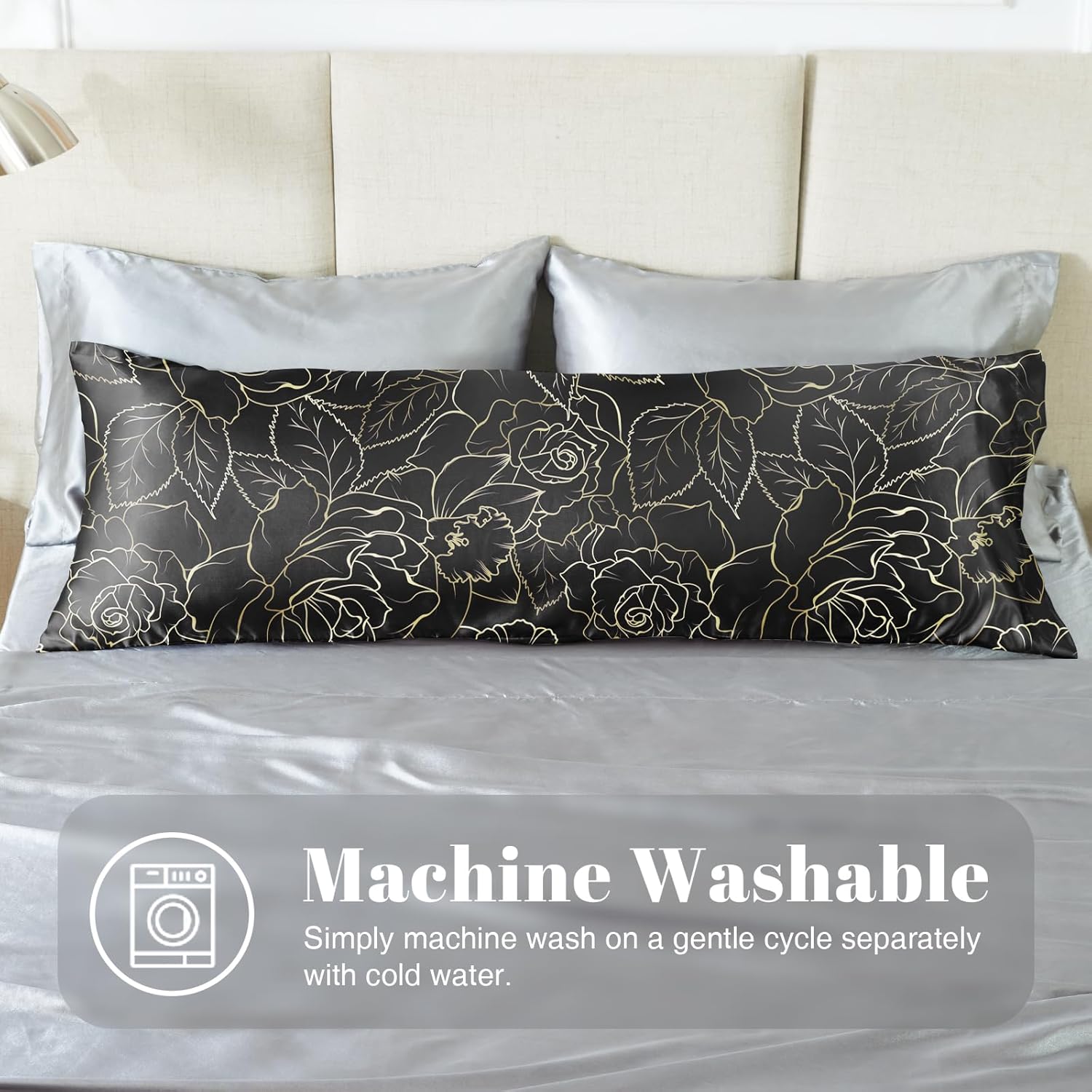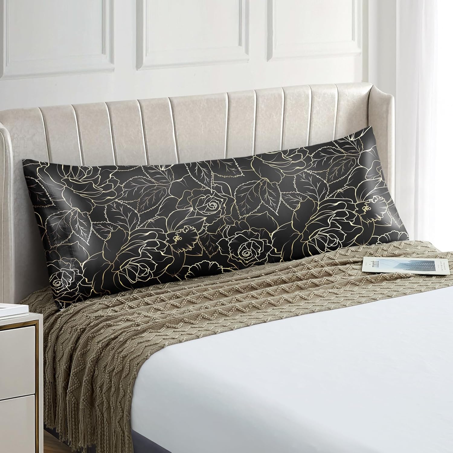 EXQ Home Satin Body Pillowcase for Hair and Skin- Rose on Black Silk Long Pillowcase 20x54 inches - Satin Pillow Cases with Envelope Closure, Gifts for Women