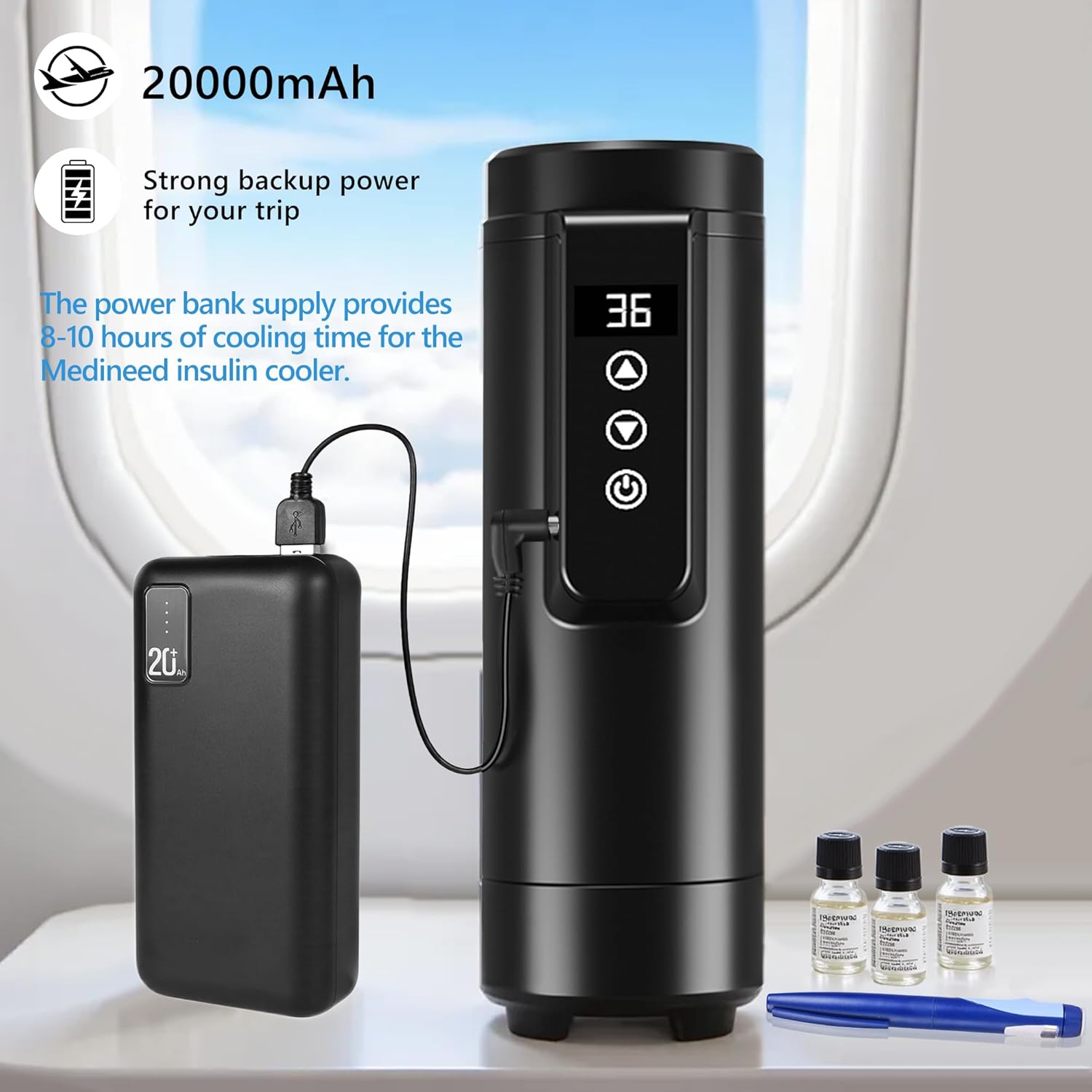 - PORTABLE TRAVEL: The medication cooler for travel is TSA approved, and protective cup cover bag can hold the diabetes care cooler and powerbank, making your traveling more convenient; The matching 20,000mAh portable power bank supply provides 8-10 hours of cooling time for the Medineed insulin cooler