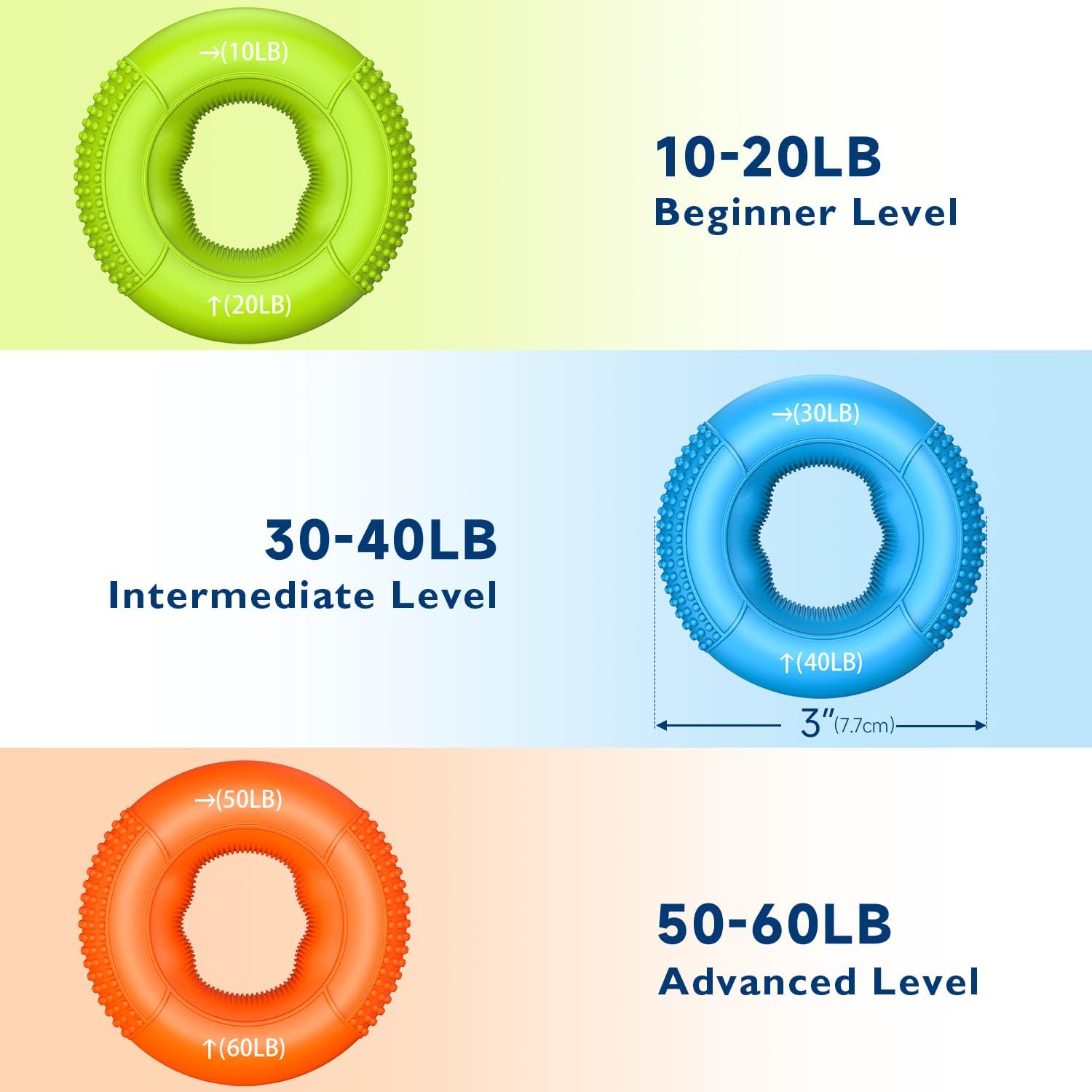 - 𝗟𝗼𝗻𝗴-𝗹𝗮𝘀𝘁𝗶𝗻𝗴 & 𝗙𝗹𝗲𝘅𝗶𝗯𝗹𝗲 𝗚𝗿𝗶𝗽 𝗥𝗶𝗻𝗴𝘀: Advance your hand strength with our progressive hand gripper rings, offering adjustable resistance from a gentle 10-20LB to a tough 50-60LB. Each ring is made from premium food-grade silicone, ensuring lasting elasticity and shape retention. The non-slip textured surface provides a secure and comfortable grip.