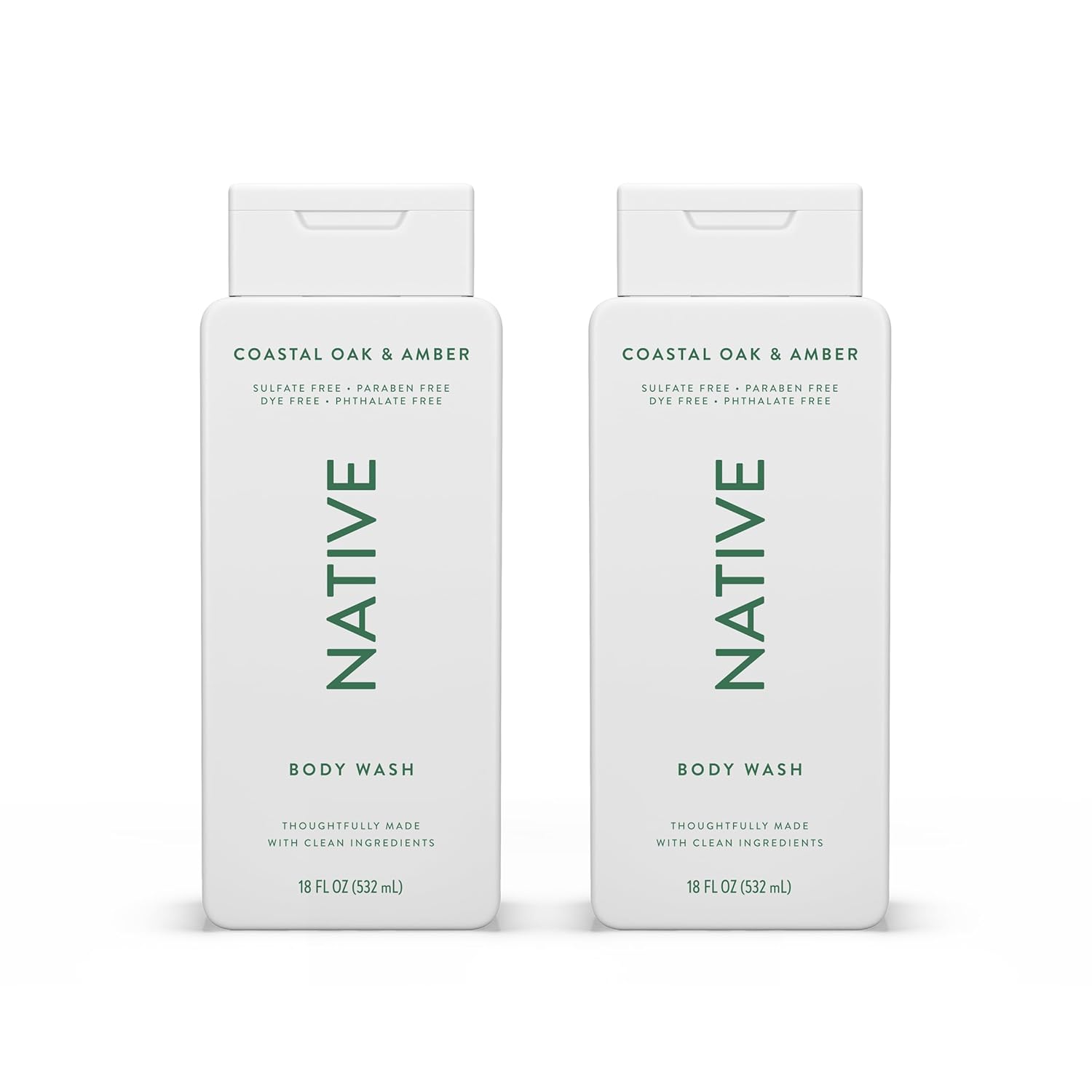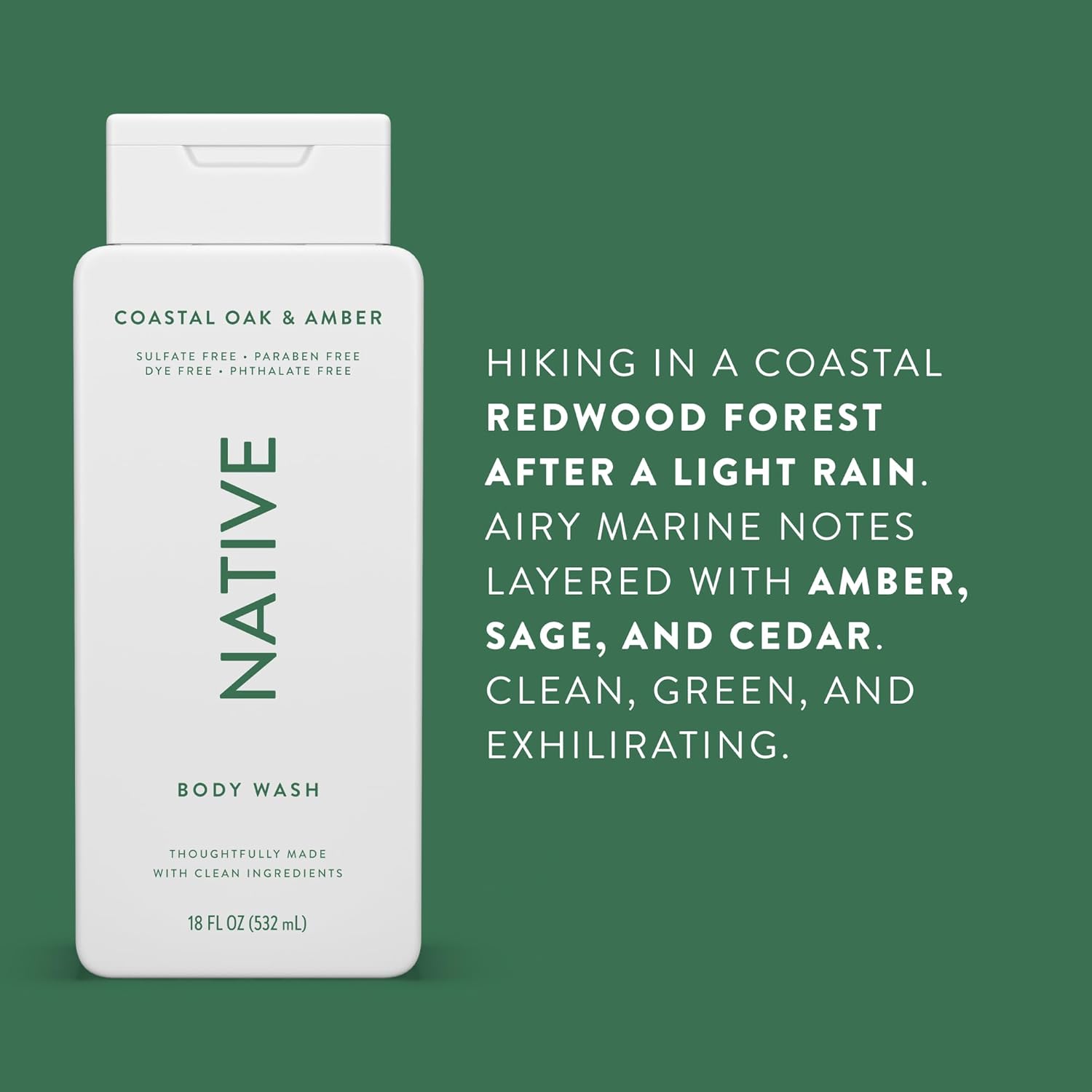 Native Body Wash Contains Naturally Derived Ingredients | For Women & Men, Sulfate, Paraben, & Dye Free Leaving Skin Soft and Hydrating | Coastal Oak & Amber 18 oz - 2 Pk