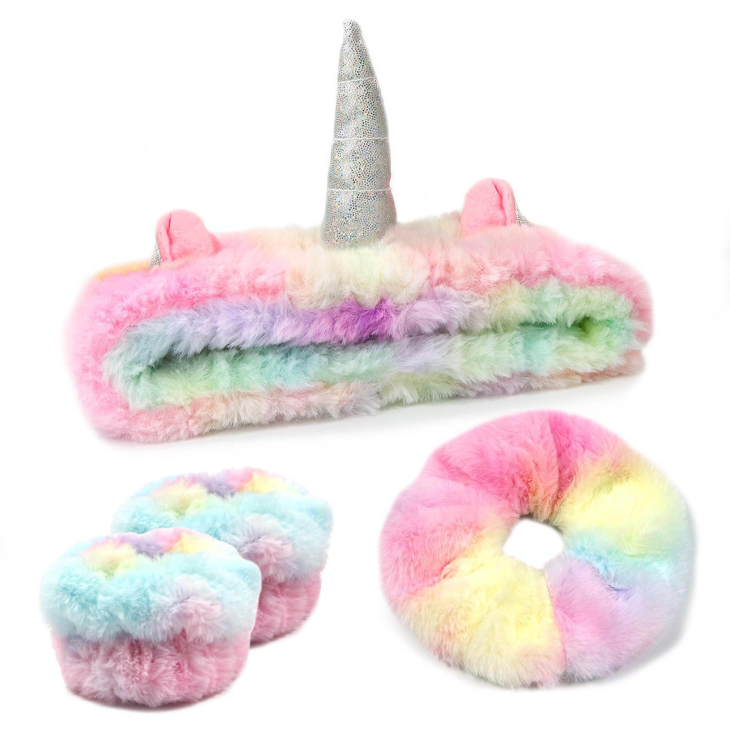 Face Wash Headband Set With Wrist Bands and Hair Scrunchie - Cute Rainbow Elastic Spa Hair Bands for Washing Face, Makeup, Skincare