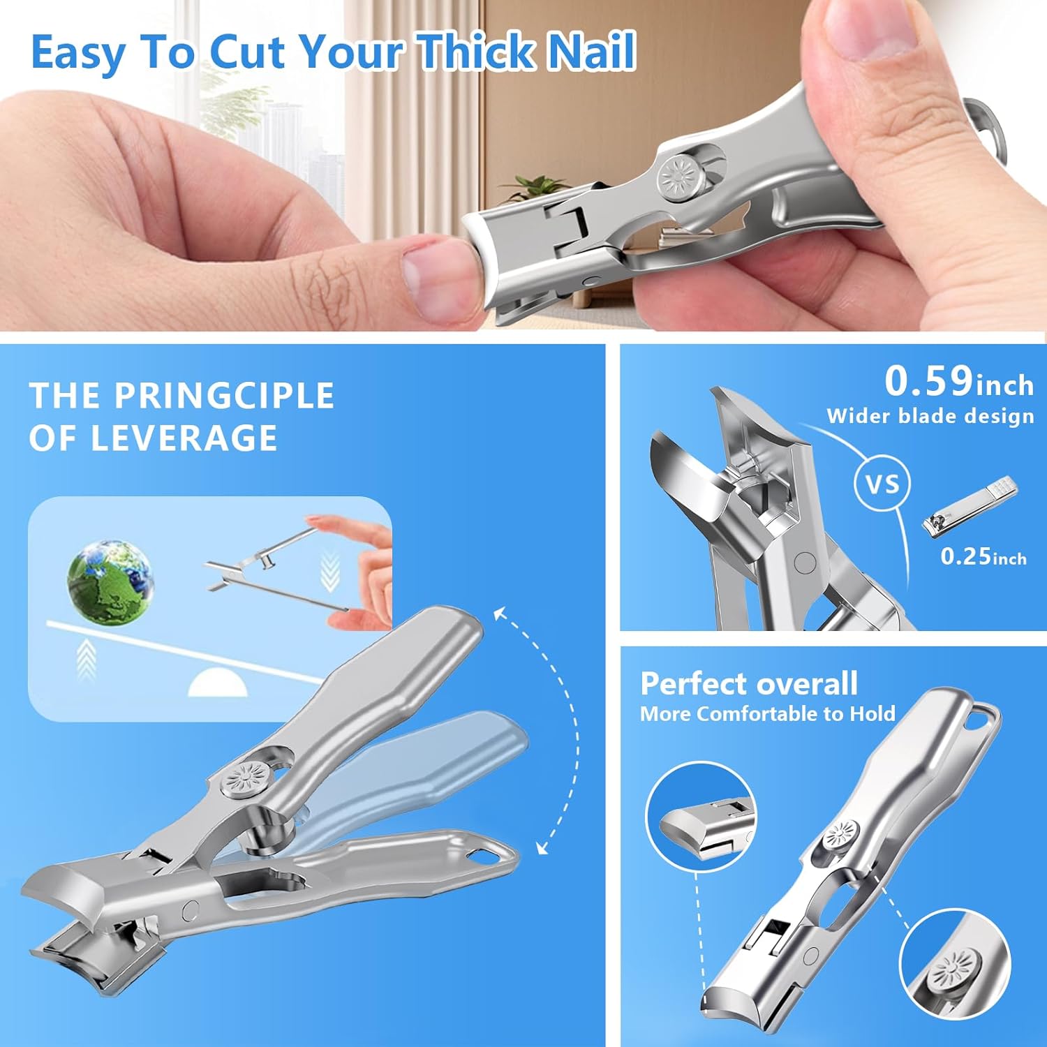 - ✔【Nail Clippers's Wide Opening Curved Sharp Blade Design】: The toenail clippers for thick toenails includes 12mm Curved Sharp Blade width design as Fits nails perfectly to provide precise cutting. Coupled with the ergonomic and unique lever design, lift the upper handle and move the lever from back to front,and you can easily cut nails by simply pressing down on the handle. Our nail clippers are also equipped with Perfectly contoured anti-slip handle, which is safer, easier and more convenient.