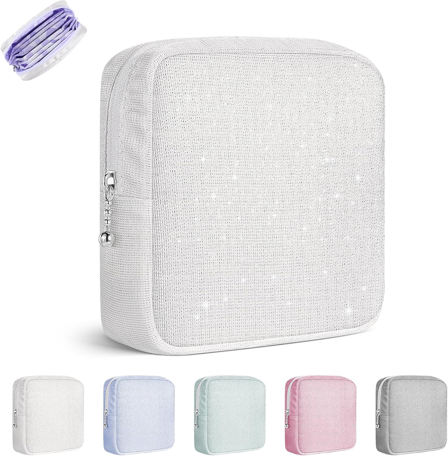 - 【Suitable Size】Measuring: 5.6*5.7*1.3 inches. Glitter sanitary napkin pouch can holds up to 10 normal size sanitary napkins and 4 tampons simultaneously. Whether you are at office, outdoors or traveling, the sanitary pad pouch can easily fit in your bag