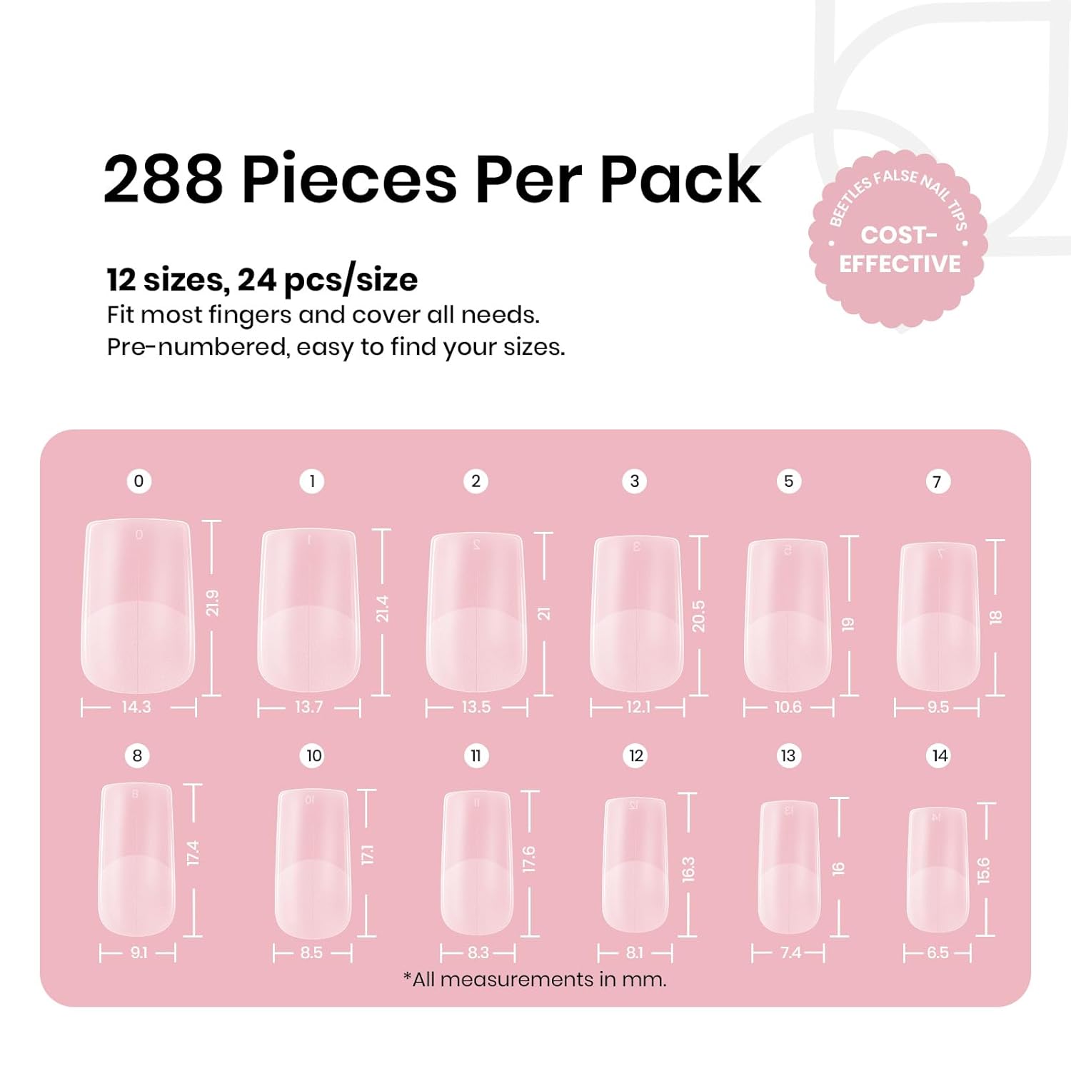 - 12 Sizes, 24 Tips Each: Whether you have wide, flat, or narrow nail beds, Beetles has you covered! Our pack includes 288 pre-numbered tips in 12 sizes (0/1/2/3/5/7/8/10/11/12/13/14, 24 tips per size), ensuring a custom fit for every finger. No more struggling to find the right size – your perfect match is in the box!