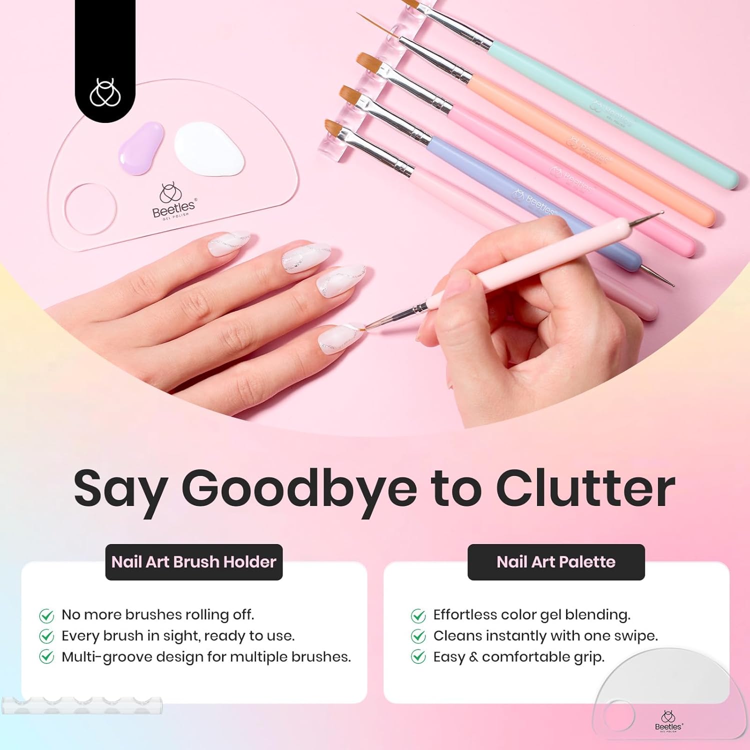 - 【What You Get】Beetles 5 double headed pens, including 5 different lengths of Liner Brush(7mm,9mm,11mm,20mm,25mm), Flat Brush, Oval Brush, Petal Painting Brush, Gradient Brush and Dotting Pen. Meet the various forms you need for nail art painting. It is also equipped with pen holder and color palette for fixing nail art pens and color grading, making it very simple and convenient for you to engage in nail art creation.