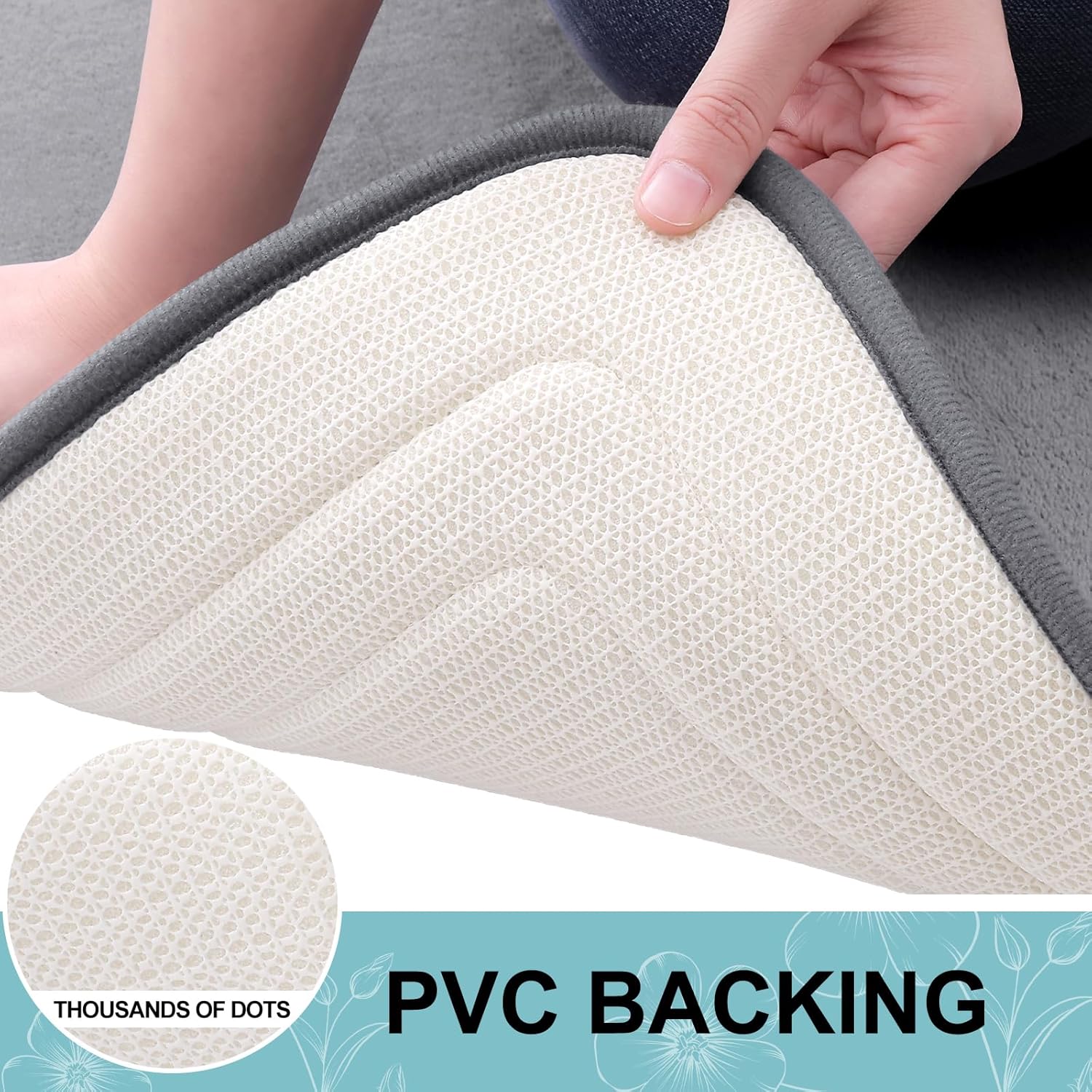 - [STABLE FOOTING] Our bathroom mat is equipped with a robust and enduring PVC backing, preventing shifting and skidding. Unlike mats with rubber backing that may wear off after washing, our bath mat ensures lasting durability. For a secure footing, keep the floor beneath the rug dry and avoid placing it on wet surfaces.