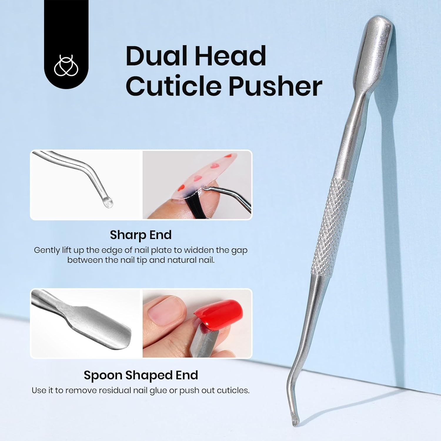 - Easy Application & Removal for Nail Art Gift for Girls-- ①Use the pointed end of the steel pusher to pry a small gap between the nail plate and the nail. ②Apply fake nail remover between the gaps to soften the glue, wait for 60s. ③Use the flat end of tool to push and remove the remaining glue of surface. ④Repeat the above steps until the nail glue is completely removed. *Please watch the video for detailed tutorials.