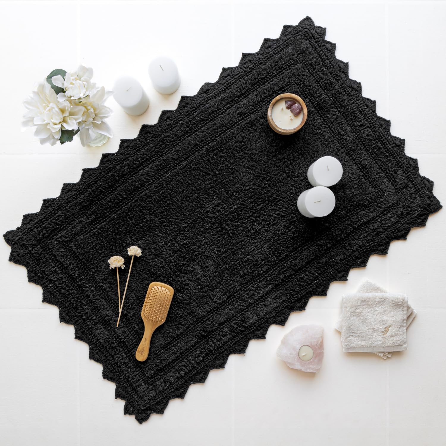 RAJRANG Black Cotton Bath Mat | Rectangle 34x21 Inches Soft Reversible Boho Rug with Crochet Detailing for Bathroom, Kitchen, or Spa | Absorbent and Washable Floor Mat