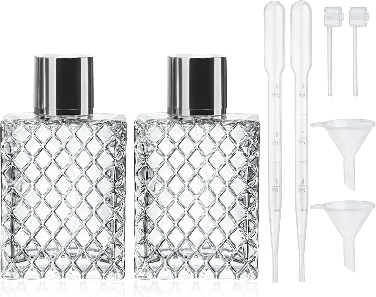 - Empty Refillable Bottle: 2 x 100ml glass fine mist spray bottle, 2 x funnels, 2 x droppers and 2 x perfume dispenser pump transfer tools. Easy to refill and no leakage!