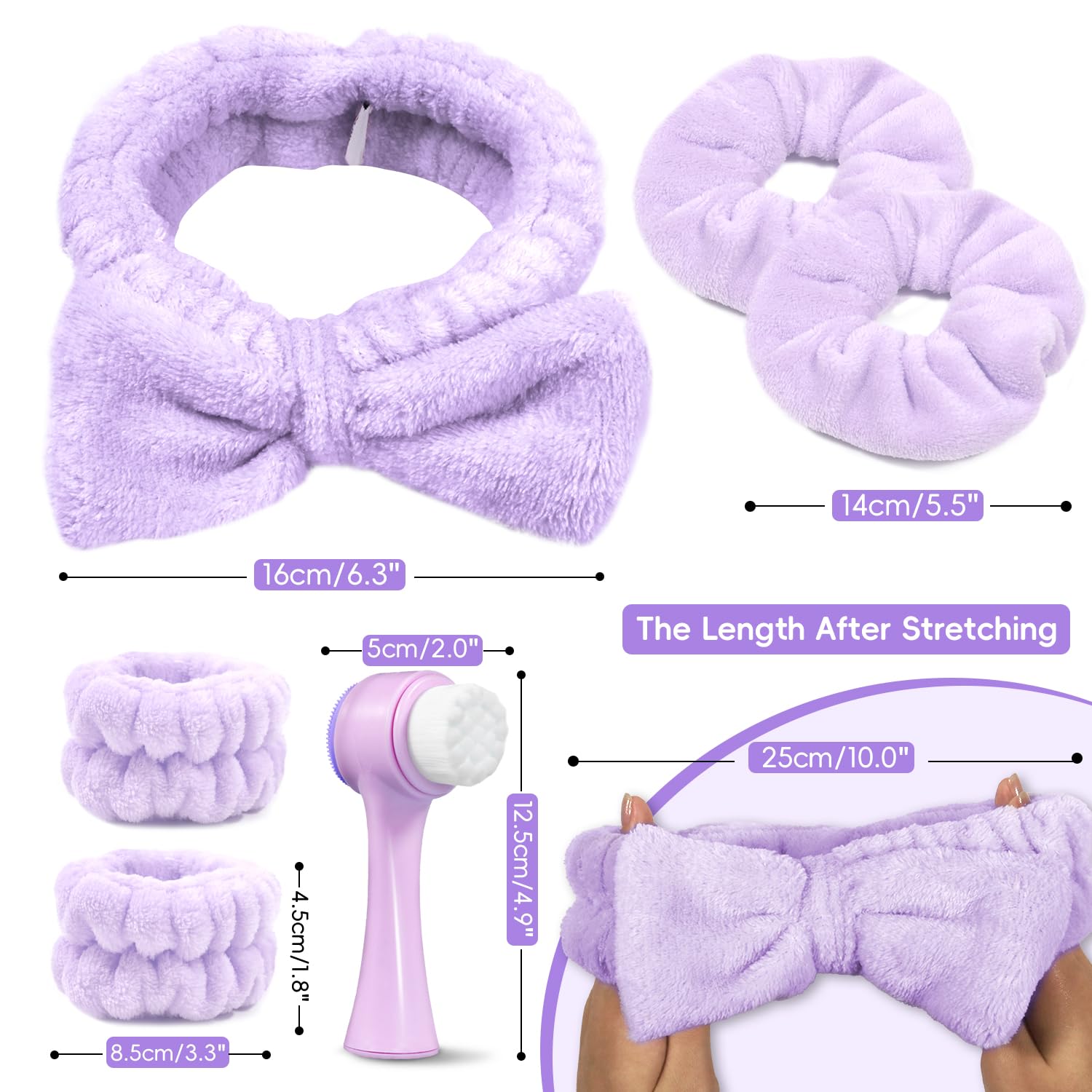 - 【What You Will Get】This high quality Face Brush Set includes a cute headband, 2 hair scrunchies, a face wash brush and 2 wrist face-washing bands. The Face Brush is designed with an ergonomic handle that perfectly fits your hands for added stability and provides a firm grip even when your hands are wet. This spa headband set is easy to wear, does not slip off, fits most people's heads, and can withstand frequent daily use without deformation. They are gentle on the scalp and do not cause discomfort even when worn for long periods of time.