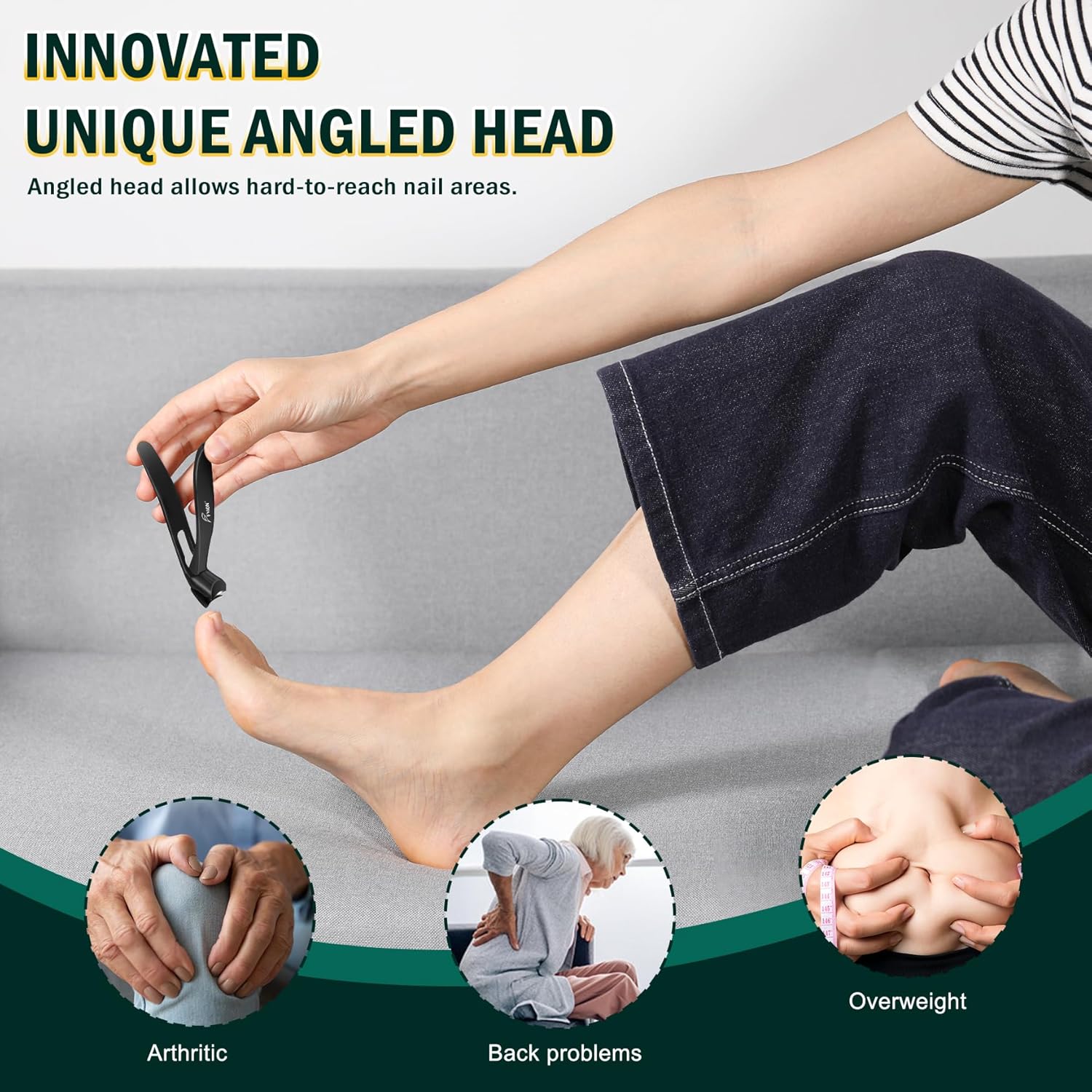 FVION 1Pcs Angled Head Nail Clippers for Seniors, Ergonomic Toenail Clipper for Thick Nails Trimming, Stainless Steel Nail Cutter Trimmer with Catcher for Men and Women (Black)
