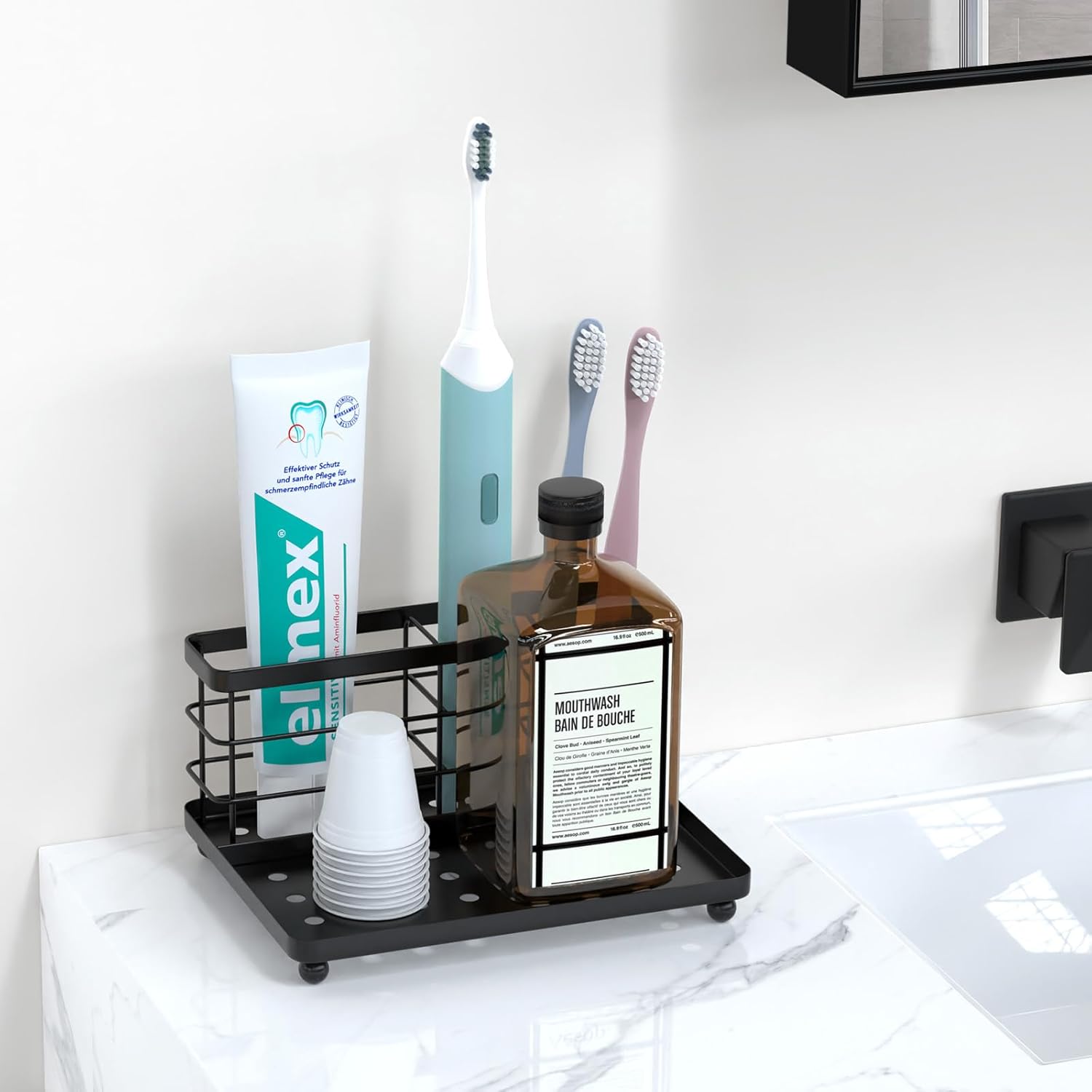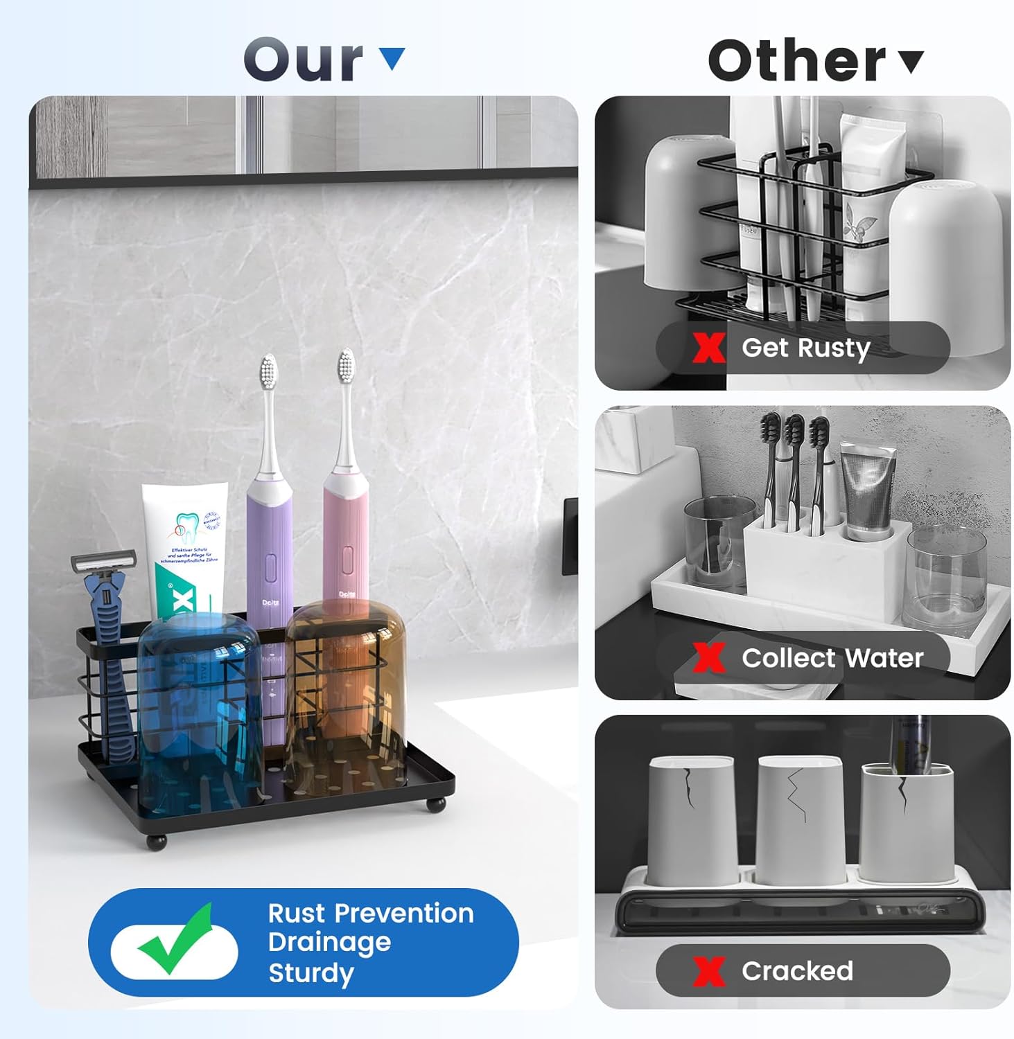 Luxspire Toothbrush Holders for Bathroom, Toothbrush Holder with Tray, Stainless Steel Holder for Toothbrush Toothpaste, Tooth Brushing Holder for Bathroom Countertop, 3-Slot, Black