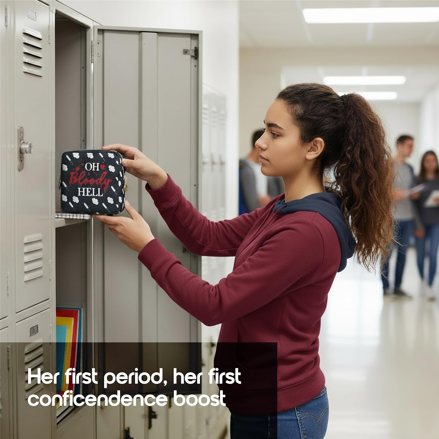 - DISCREET & COMPACT – Slim 5"x5" period bags for teen girls for school, keeps pads, tampons, and wipes hidden yet accessible. Fits easily in backpacks, purses, or lockers, giving teens and women privacy, confidence, and convenience at school, work, or on the go. Designed to sit flat on counters or locker shelves without slipping.