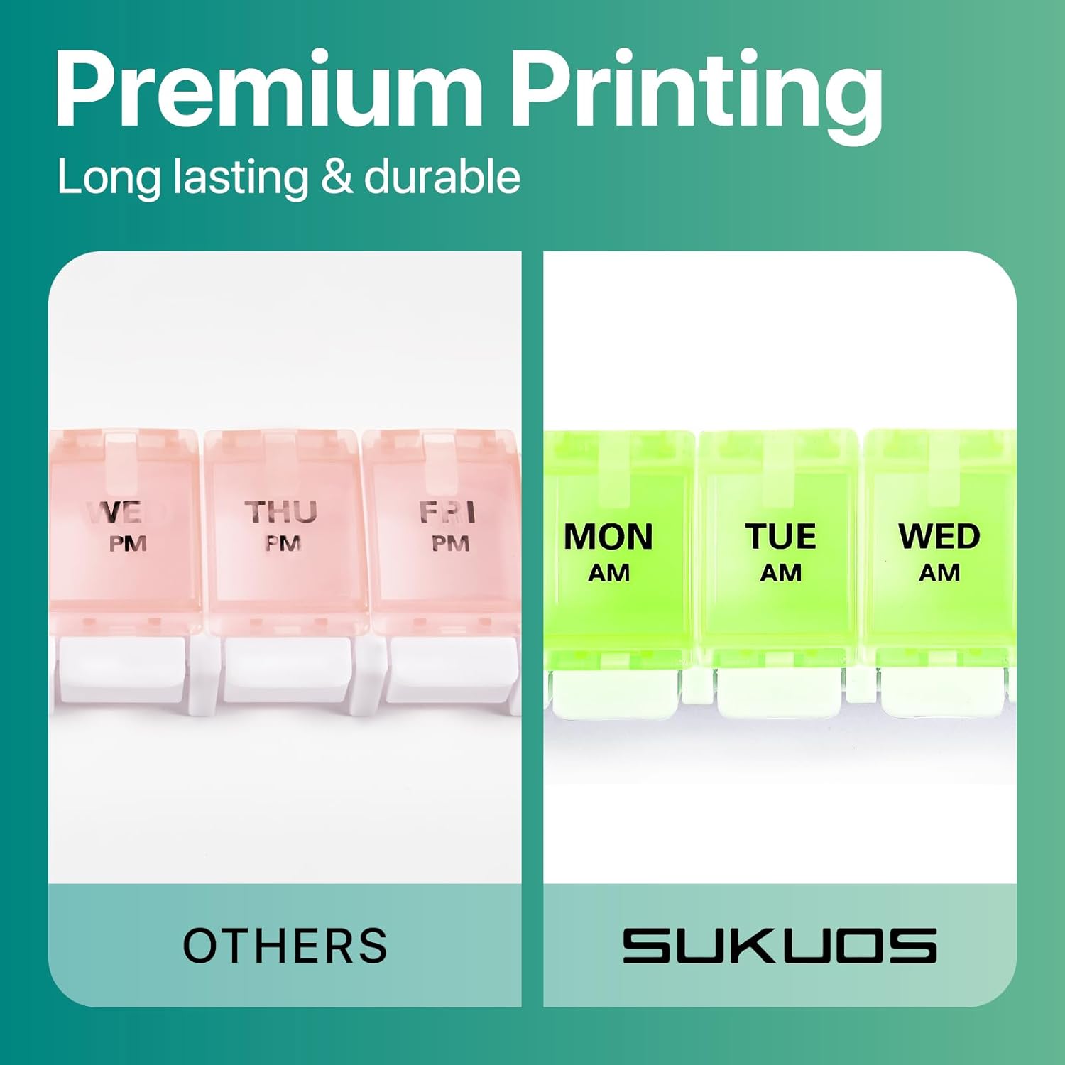 - Effortless Instant Open: Sukuos weekly pill organizer features push-button design, just press the button, and it pops open in a second. You can open it with minimal force, making it arthritis-friendly. The secure lid keeps pills dry and prevents spills, ensuring your pills stay safe and fresh.