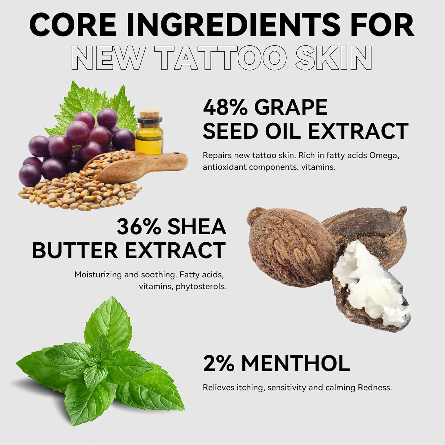 - Enhances Skin Repair, Promoting Natural Healing of New Tattoos: Our Tattoo Aftercare Serum contains 48% high-quality grape seed oil extract, The fatty acids and antioxidant components in grape seed oil can help it heal properly and preventing scabbing, peeling, or fading.