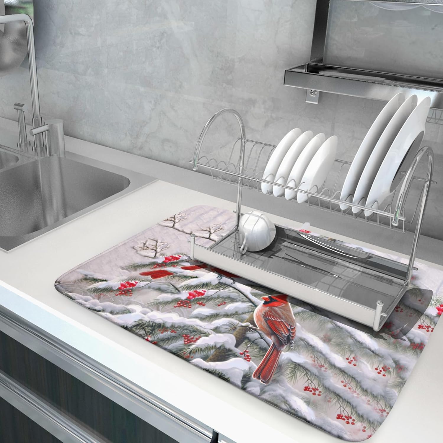 - 【Wide Usage】The dish drying mat designed with cardinal bird pattern, it is beautiful, soft, and durable. Not only a dish drying mat, cup mat, heat resistant mat, you can also use it as a kitchen countertop insulation mat. It is also a good choice to use it as a pet mat, picnic mat.