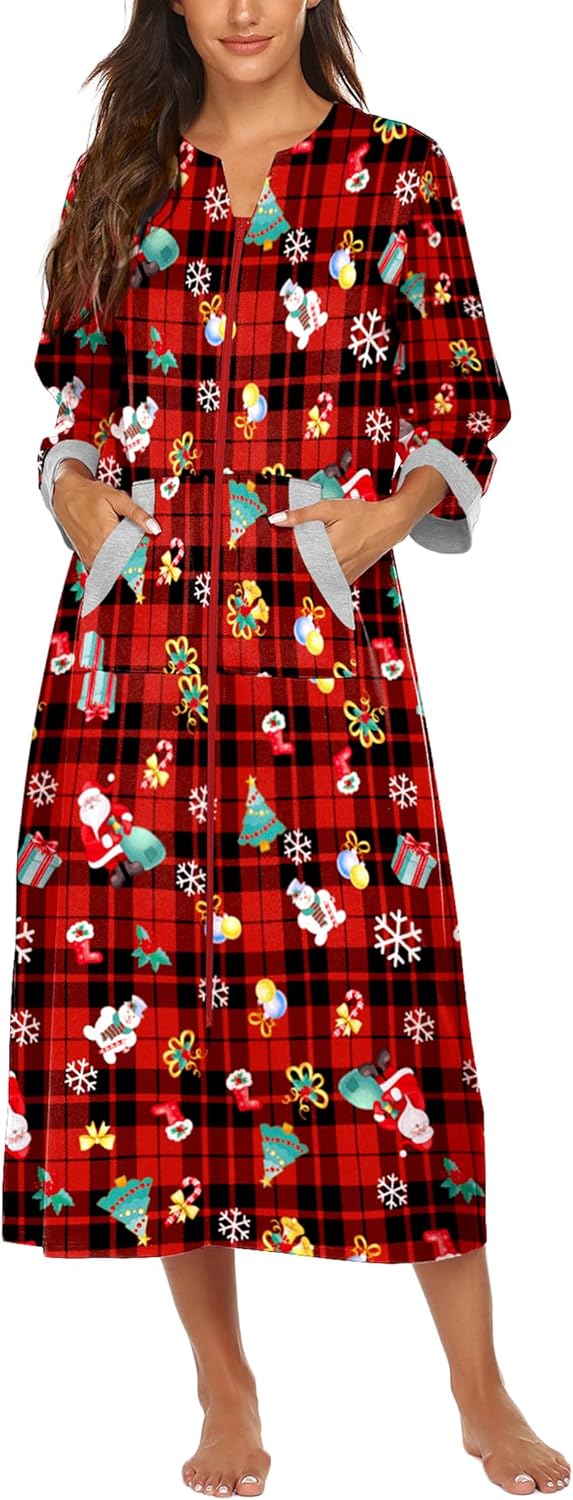Ekouaer Women Zipper Robe 3/4 Sleeves Loungewear Dress Full Length Sleepwear Pockets Housecoat Nightgown Long Bathrobe