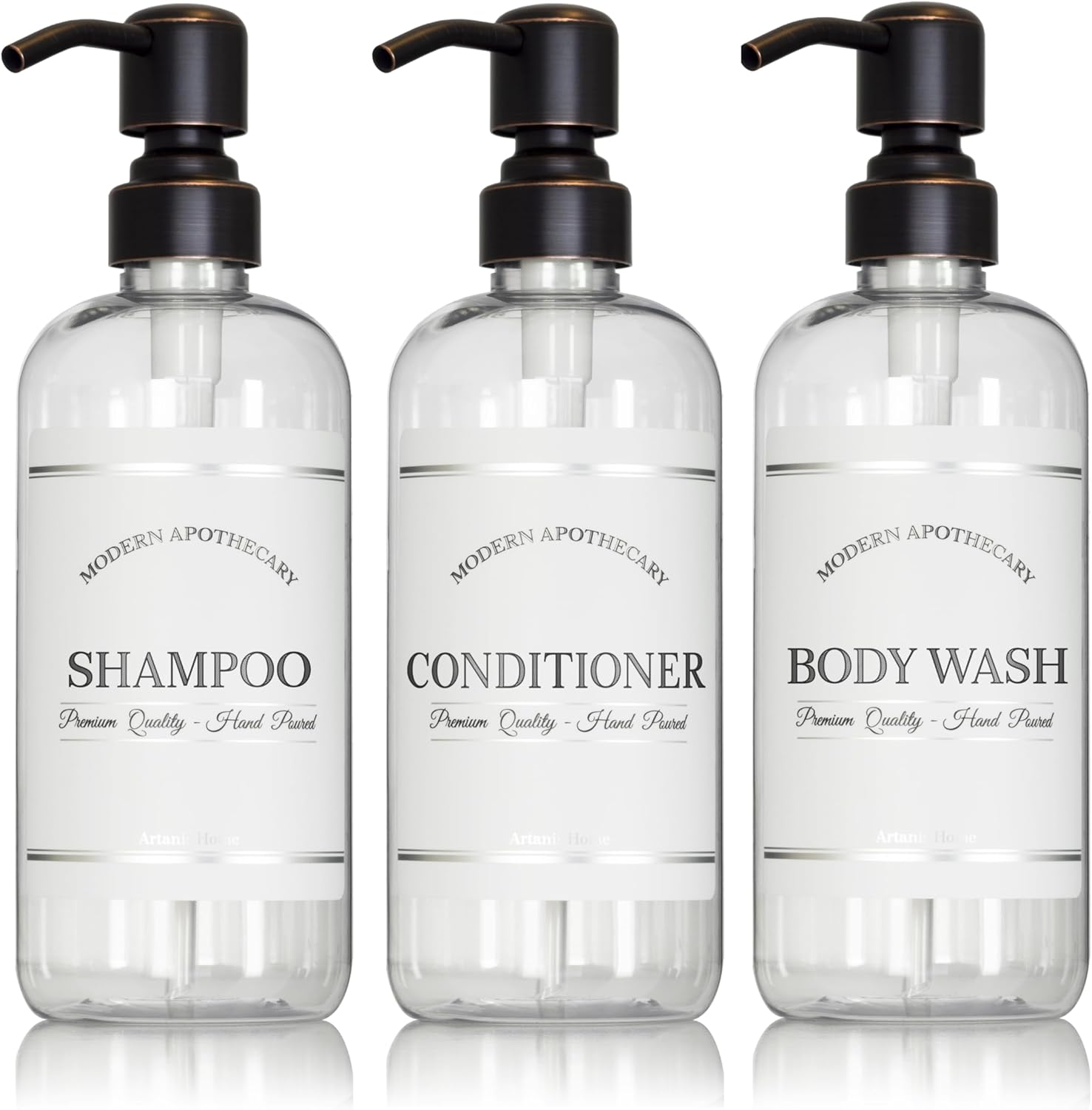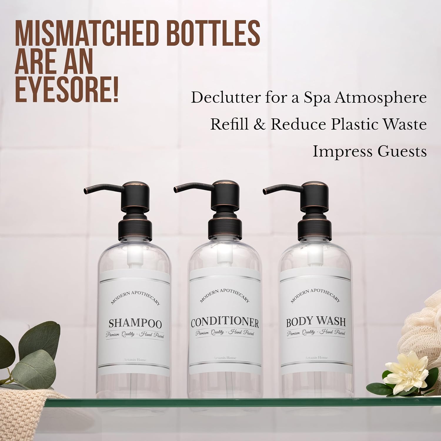 - Bring Style To Your Bathroom: Revel in the luxury of a well-organized shower. Refine your interior decor with these chic body wash, conditioner and shampoo dispenser bottles. Curate your whole home. Modern Apothecary bathroom bottles coordinate with additional matching titles for the sink, kitchen, office, and rentals. Classy, with a touch of retro flair