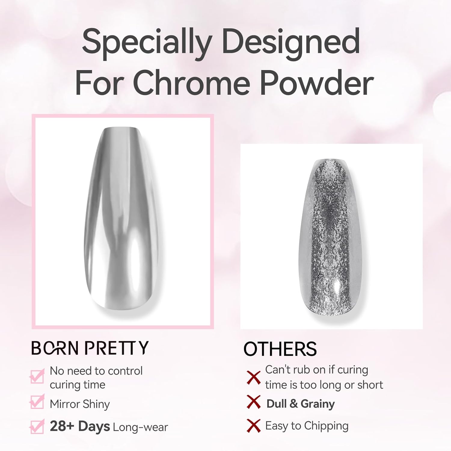 - PACKAGE CONTENTS:1 Bottle 15ml Top Gel Coat for Chrome Nail Powder. This top coat is specially formulated for the effortless application of chrome powder, mermaid powder, or holographic powder, ensuring your nails achieve a dazzling mirror-like shine with ease! Unlike general non-wipe top coats, BORN PRETTY top coat helps you apply chrome powder smoothly, without any graininess or patches.