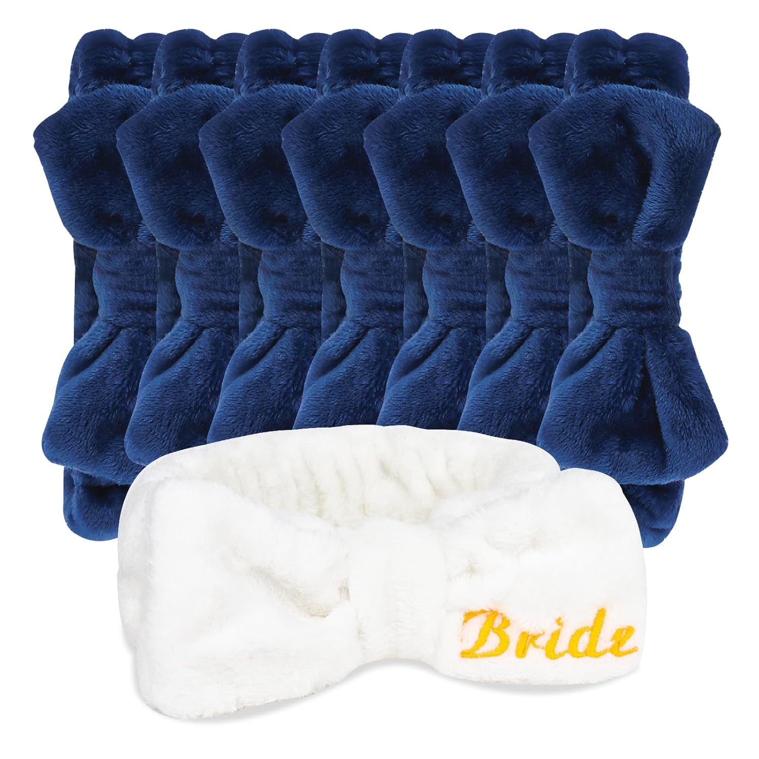 - The perfect bachelorette themed party favors: 1 white bridal spa headband +7 dark blue bridesmaid spa headbands.